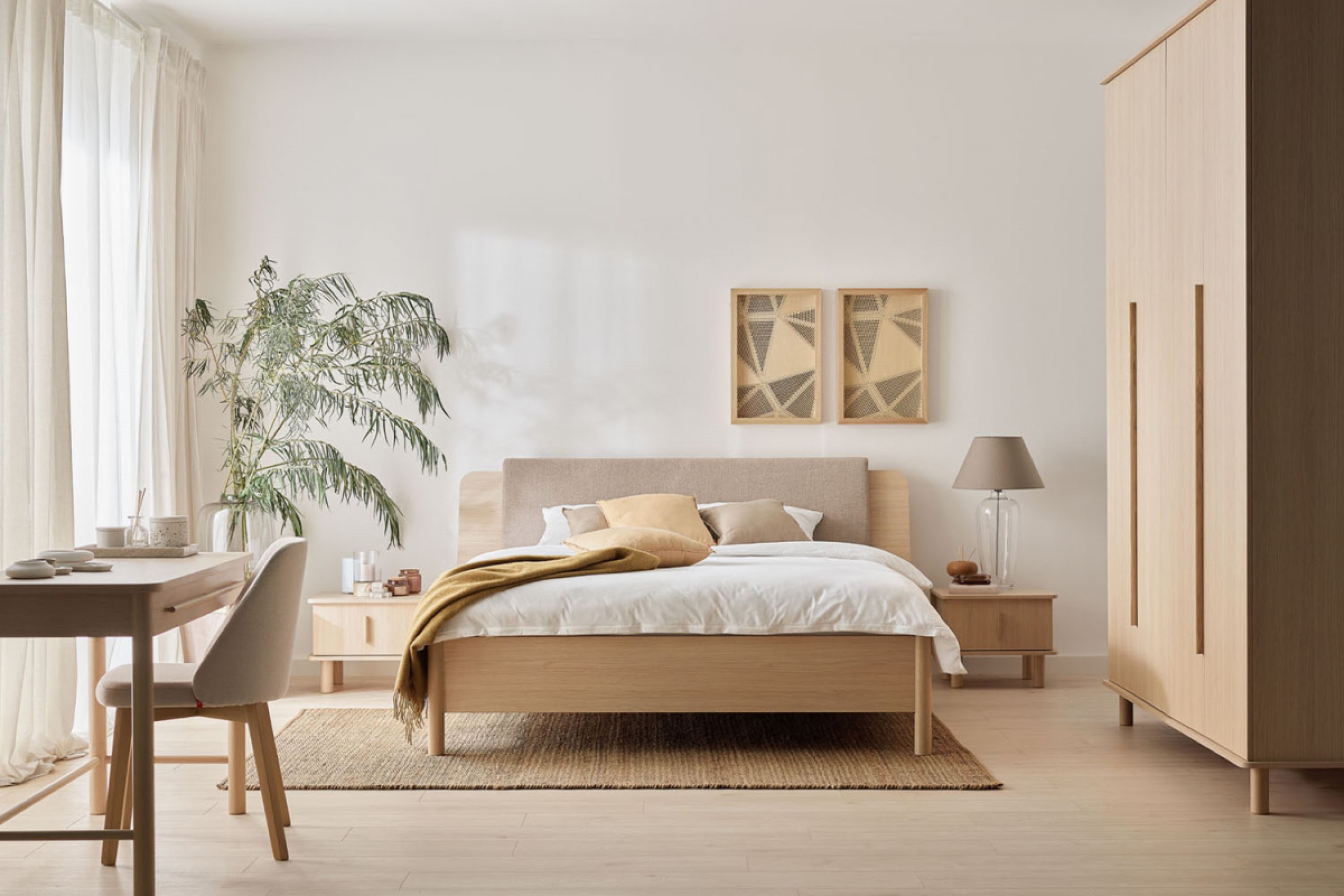 The Omm collection is characterized by its organic shapes, soft, rounded edges, and gentle lines. It helps create an atmosphere of deep relaxation. These pieces, crafted from natural materials and featuring the warm hue of oak, evoke the forms found in nature.