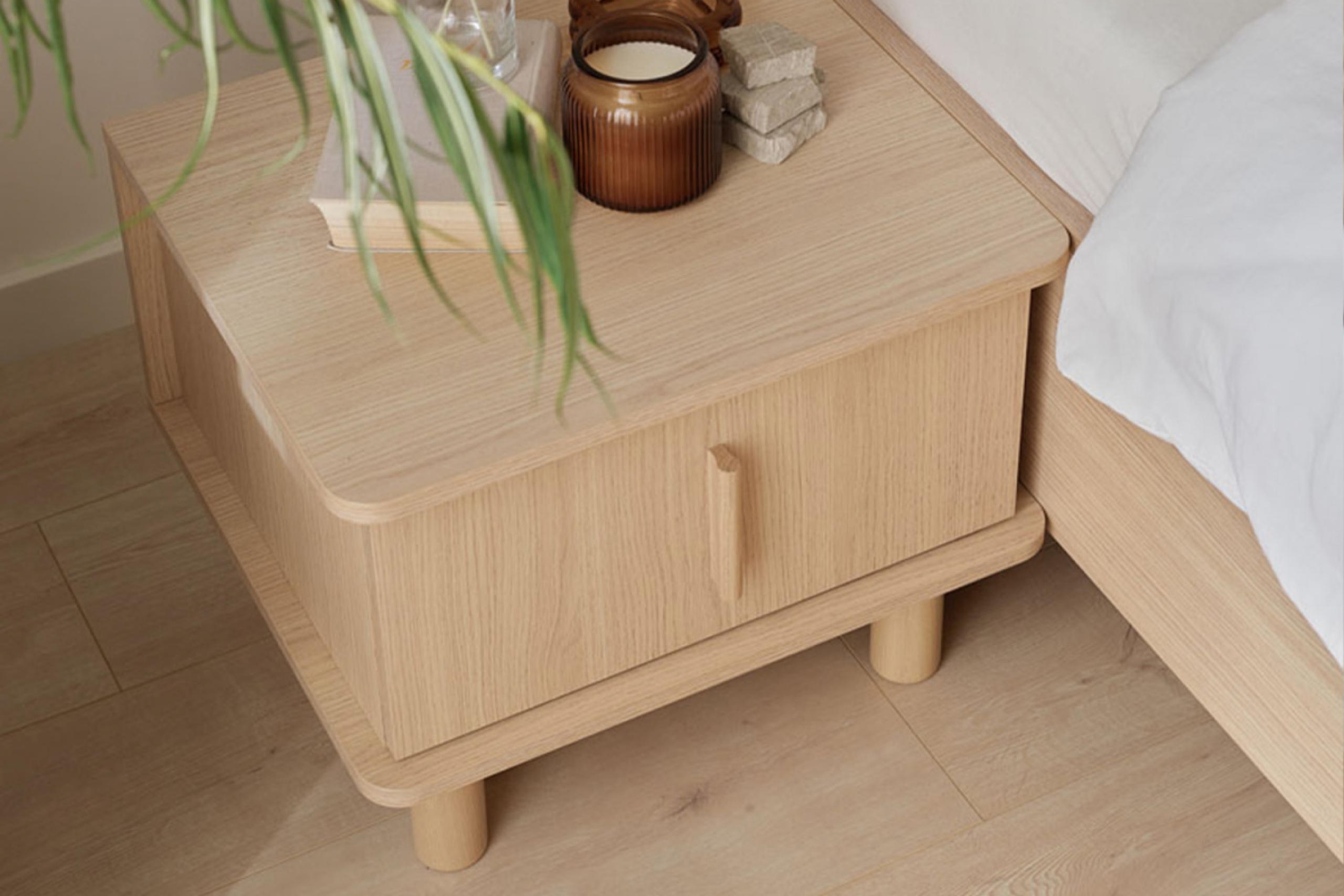 The height of the nightstand is perfectly matched to the height of the bed frame from the OMM collection, creating a beautiful set.