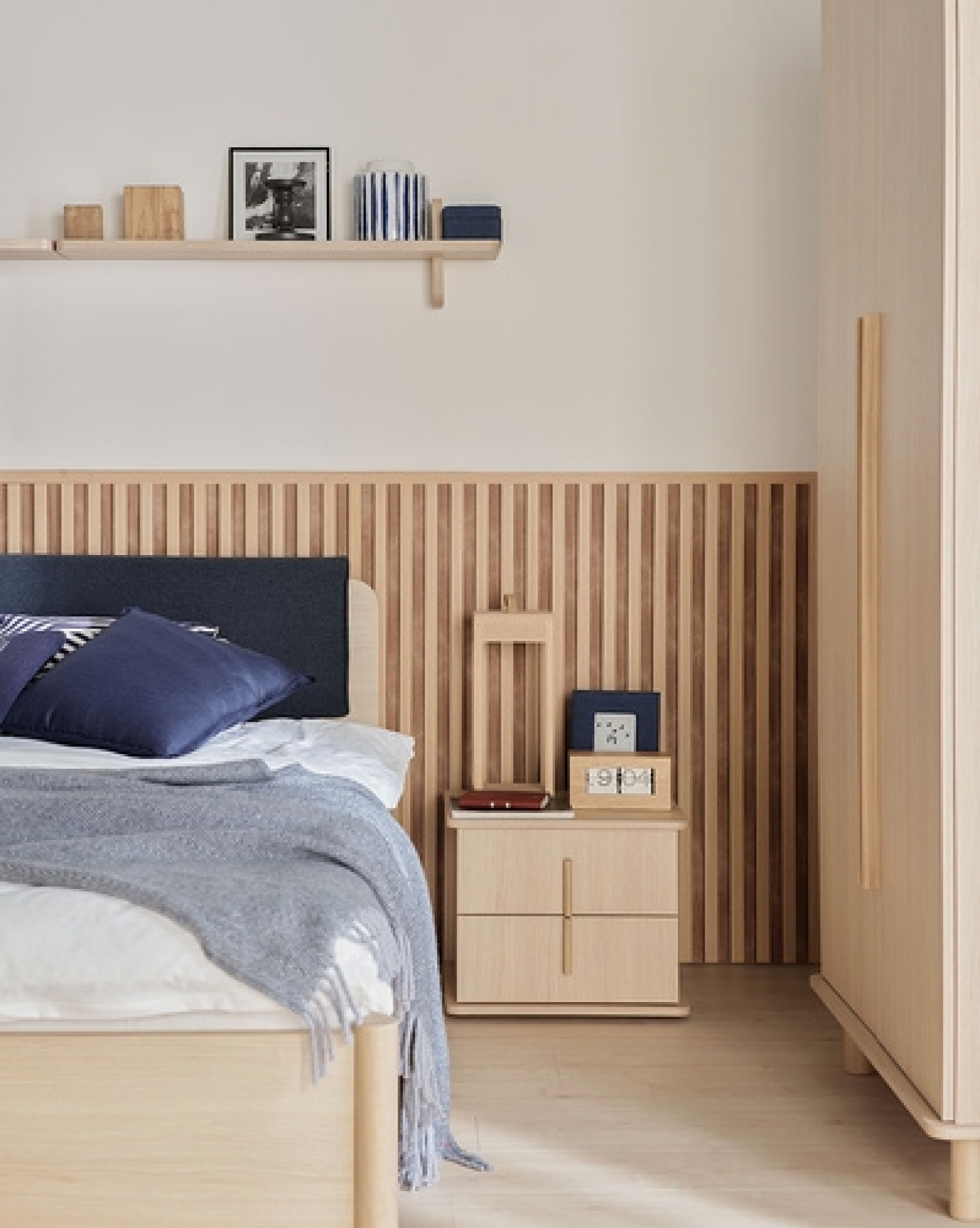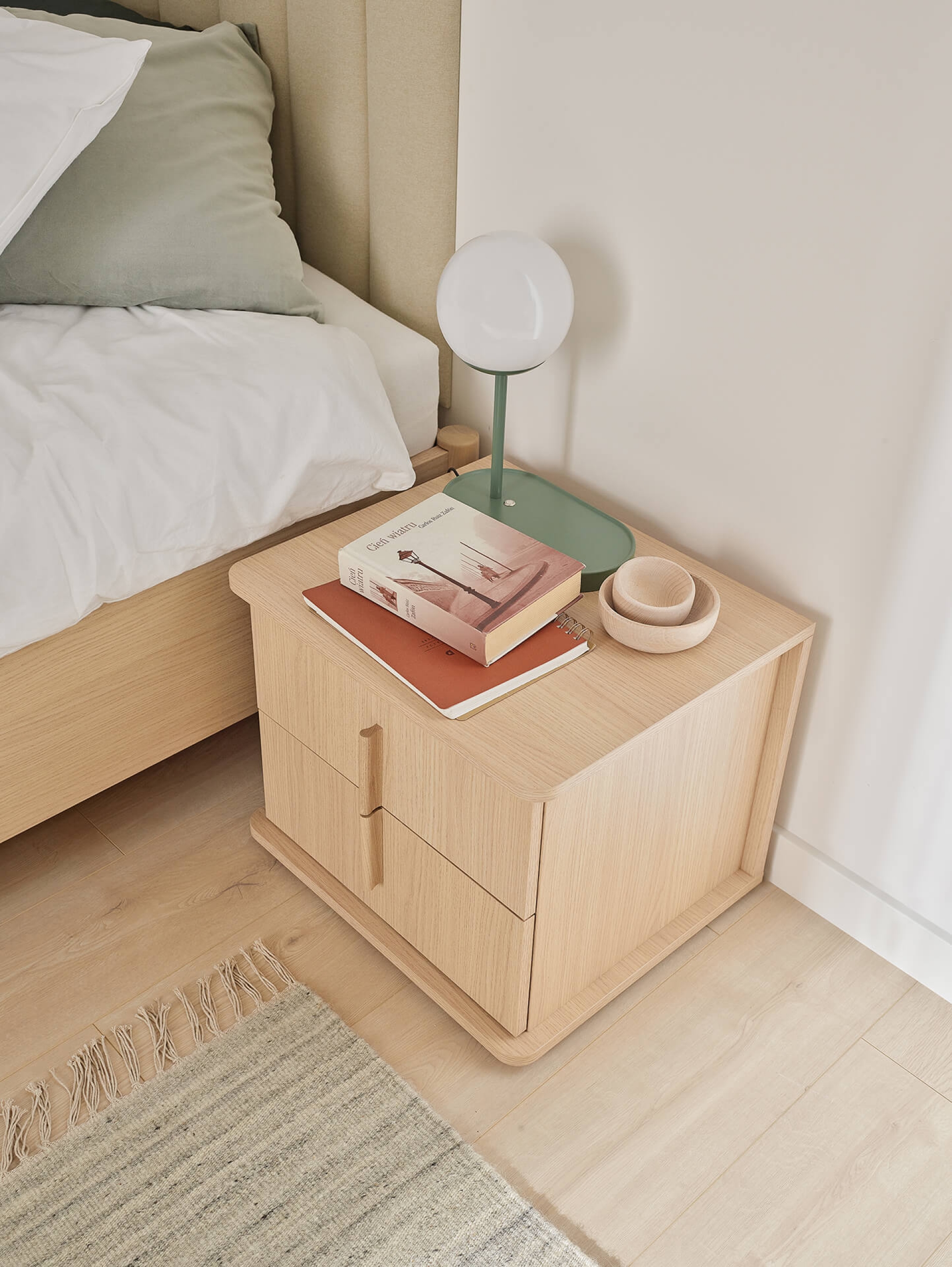 The height of the nightstand is perfectly matched to the height of the bed frame from the OMM collection, creating a beautiful set.