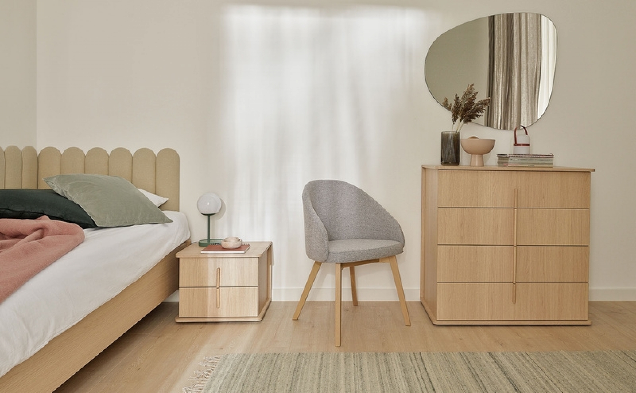 The Omm collection is characterized by its organic shapes, soft, rounded edges, and gentle lines. It helps create an atmosphere of deep relaxation. These pieces, crafted from natural materials with the warm hue of oak, evoke the forms found in nature.