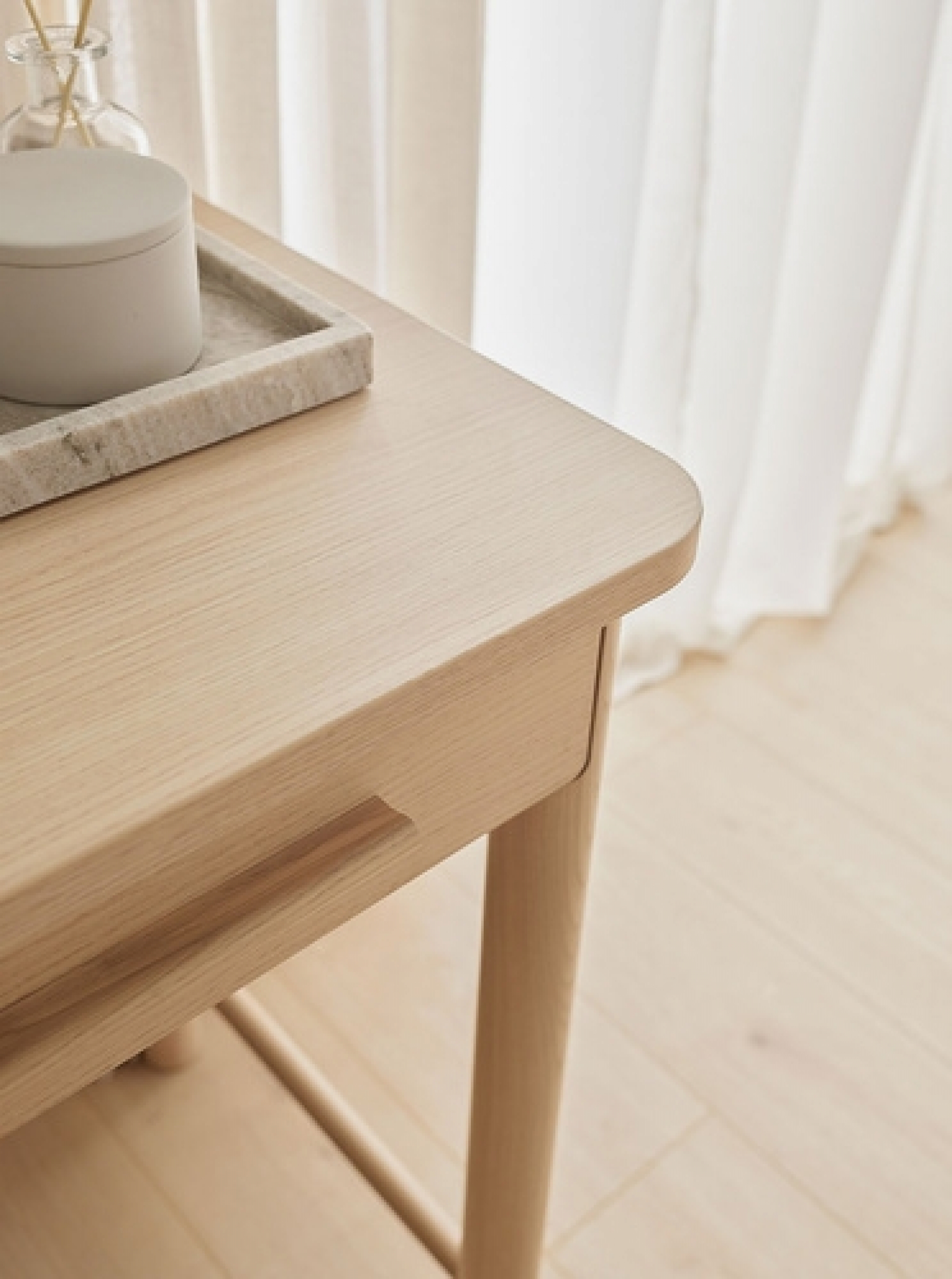 Material: The desk frame and rounded handles are made of solid oak. The body and fronts are made of laminated panels, which are easy to clean.