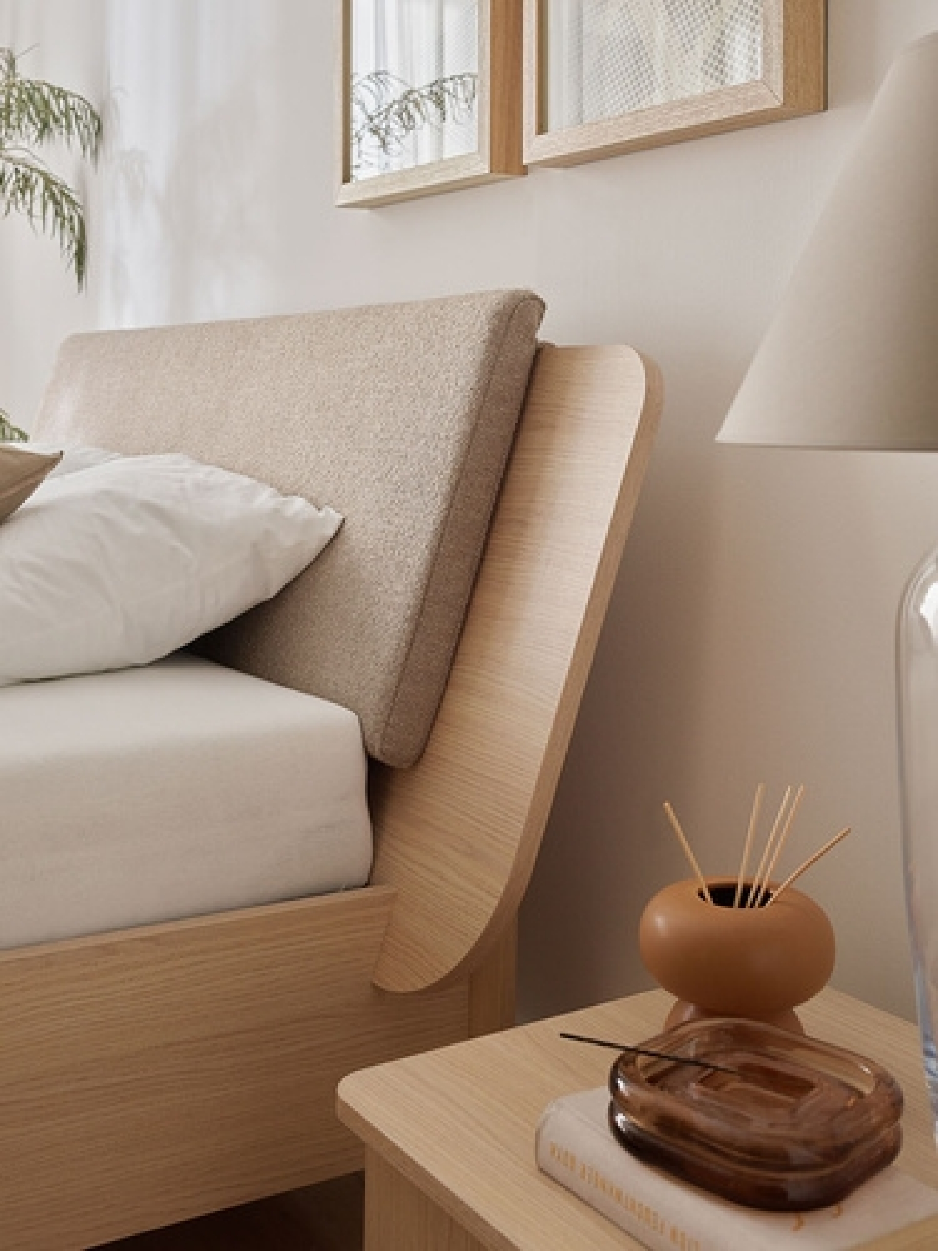 DECOR: With its rounded shapes and natural wood finish, the Omm bed by VOX will look perfect in any decor. It provides a safe and comfortable sleeping environment while adding a chic and timeless touch to your bedroom.