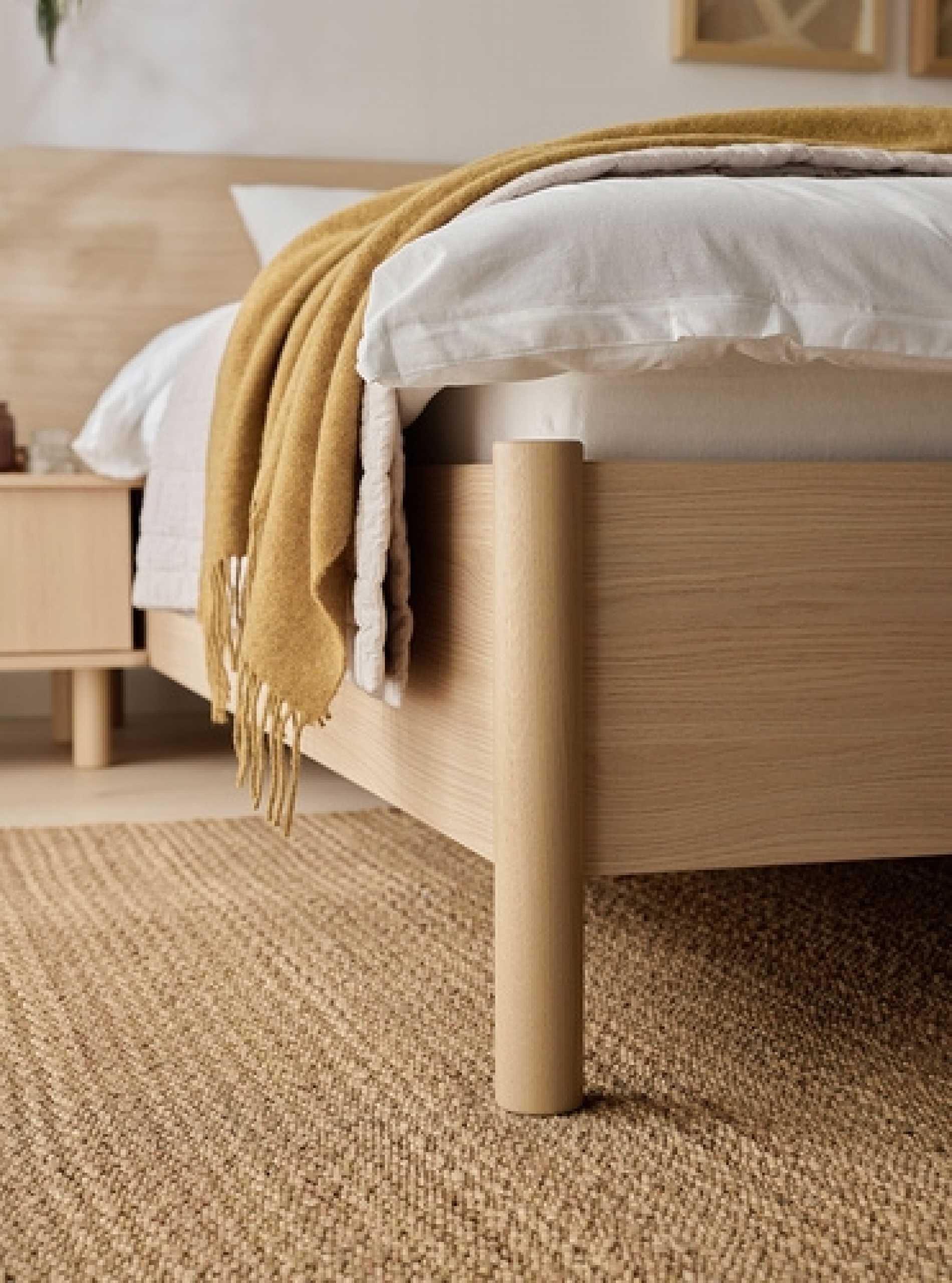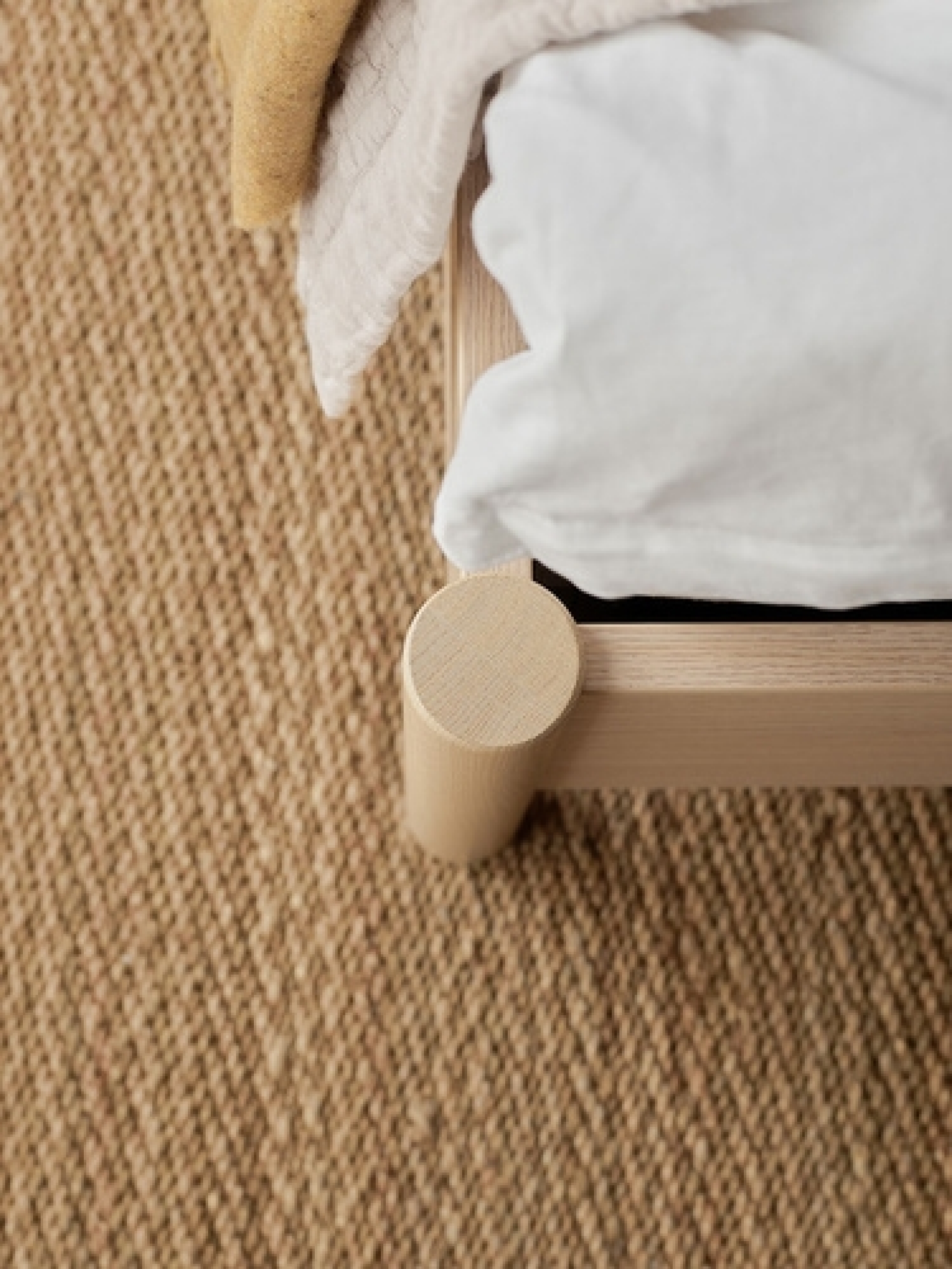 The tall cylindrical oak legs give the bed a light and unique character. They also make daily maintenance easier by freeing up floor space. The tops of the legs are adorned with a lovely detail.