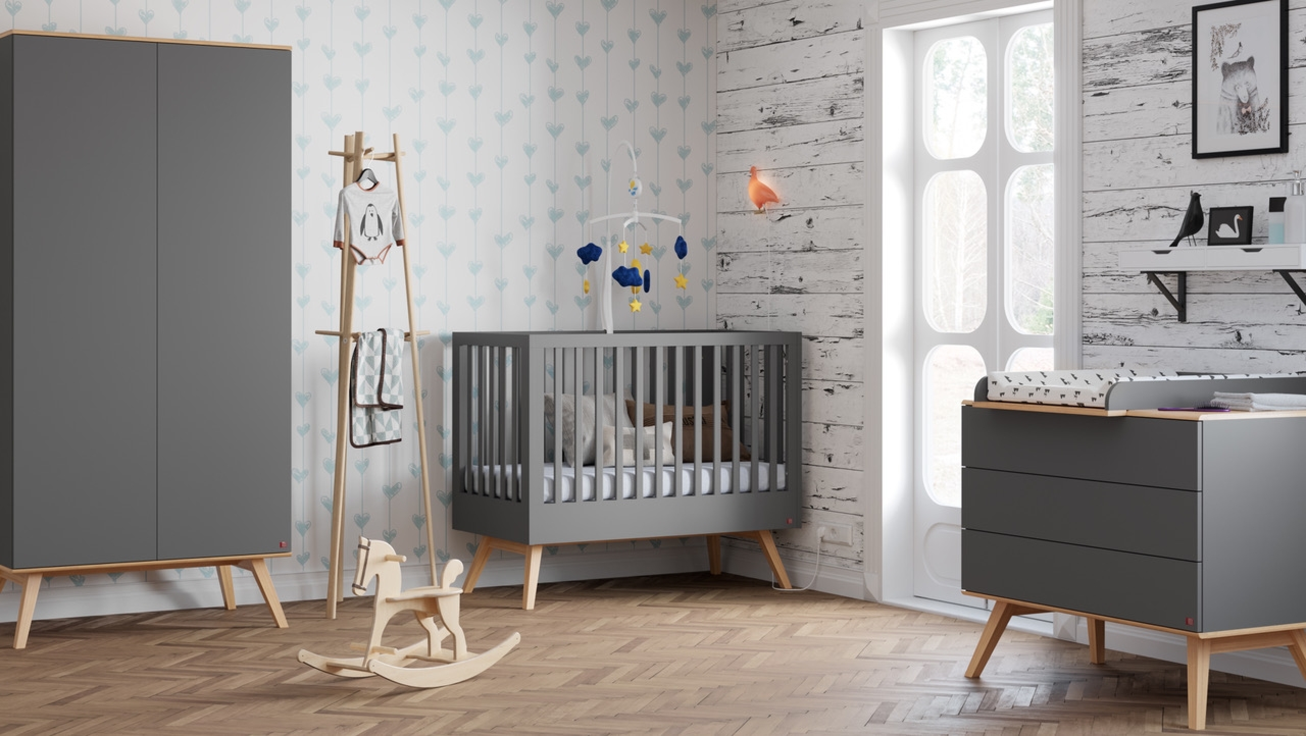 A pack included a baby bed (60 x 120 cm), a Dresser Nature With Changing Table in optional and a 2-Door Wardrobe by VOX in the Nature Collection for children and Baby, in grey. The wood and grey colour are reminiscent of Scandinavian design while the bed and the dresser are designed to be transformed in the course of your child's growth.