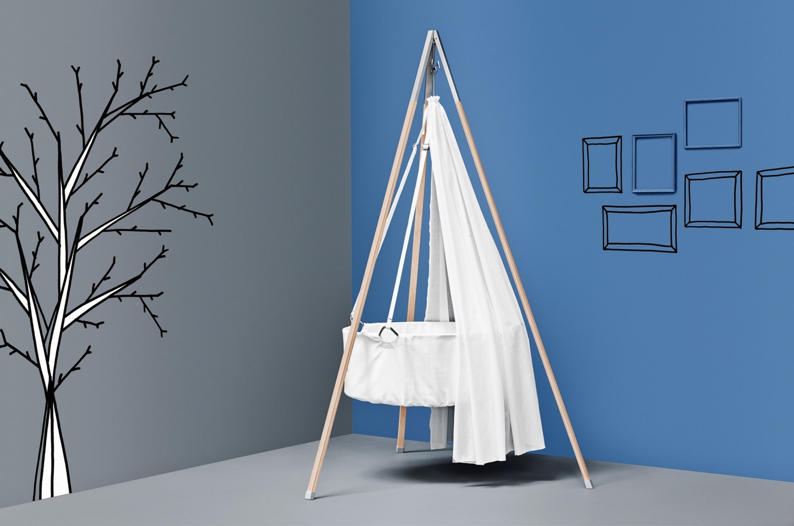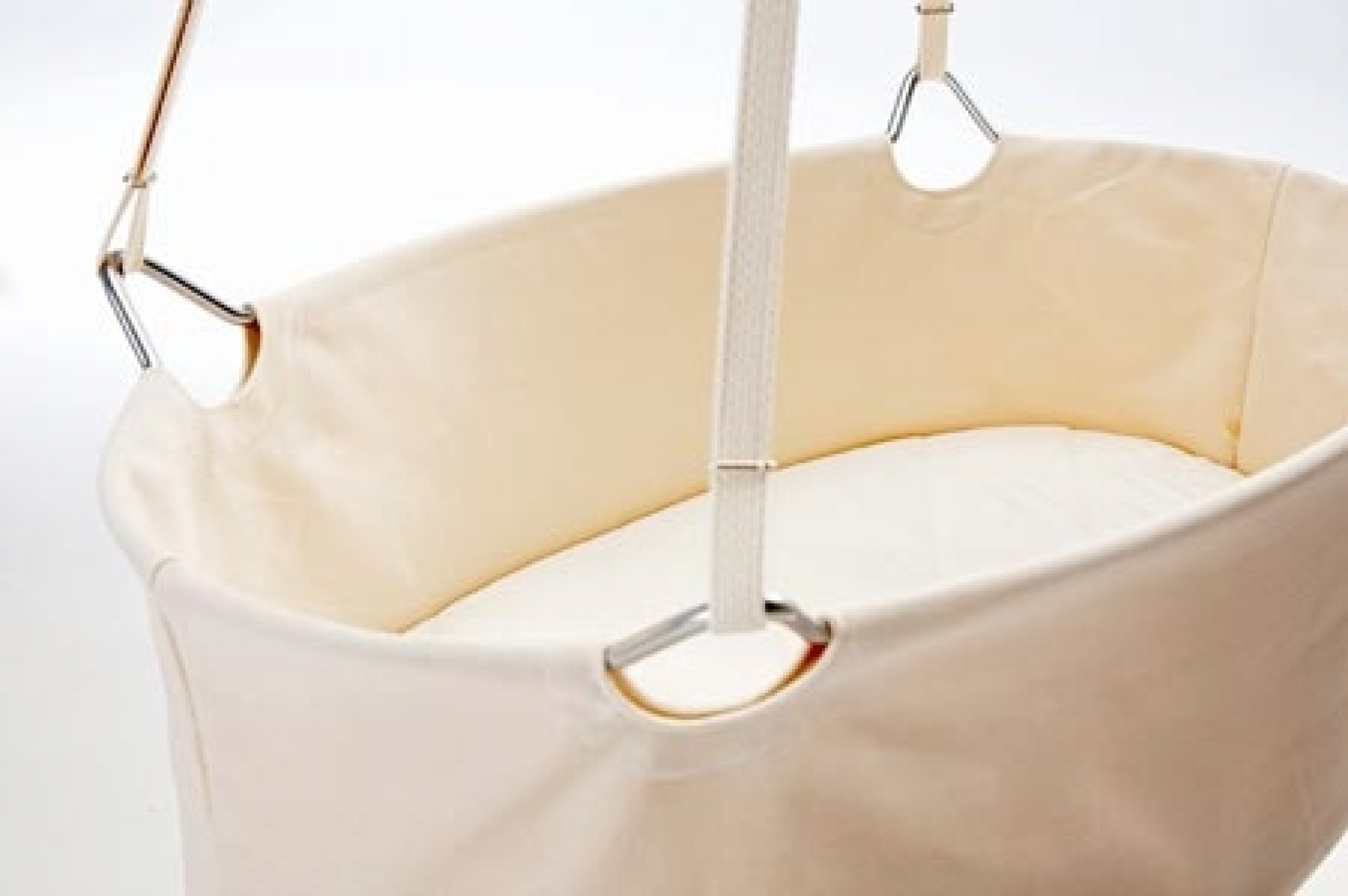 The cradle emerges from the idea to unite design and function. Especially newborns need to feel that there is something around them. They do not like to be in a bed that is too big. The oval shape of the Leander® cradle encloses the baby and creates a safe, little space.