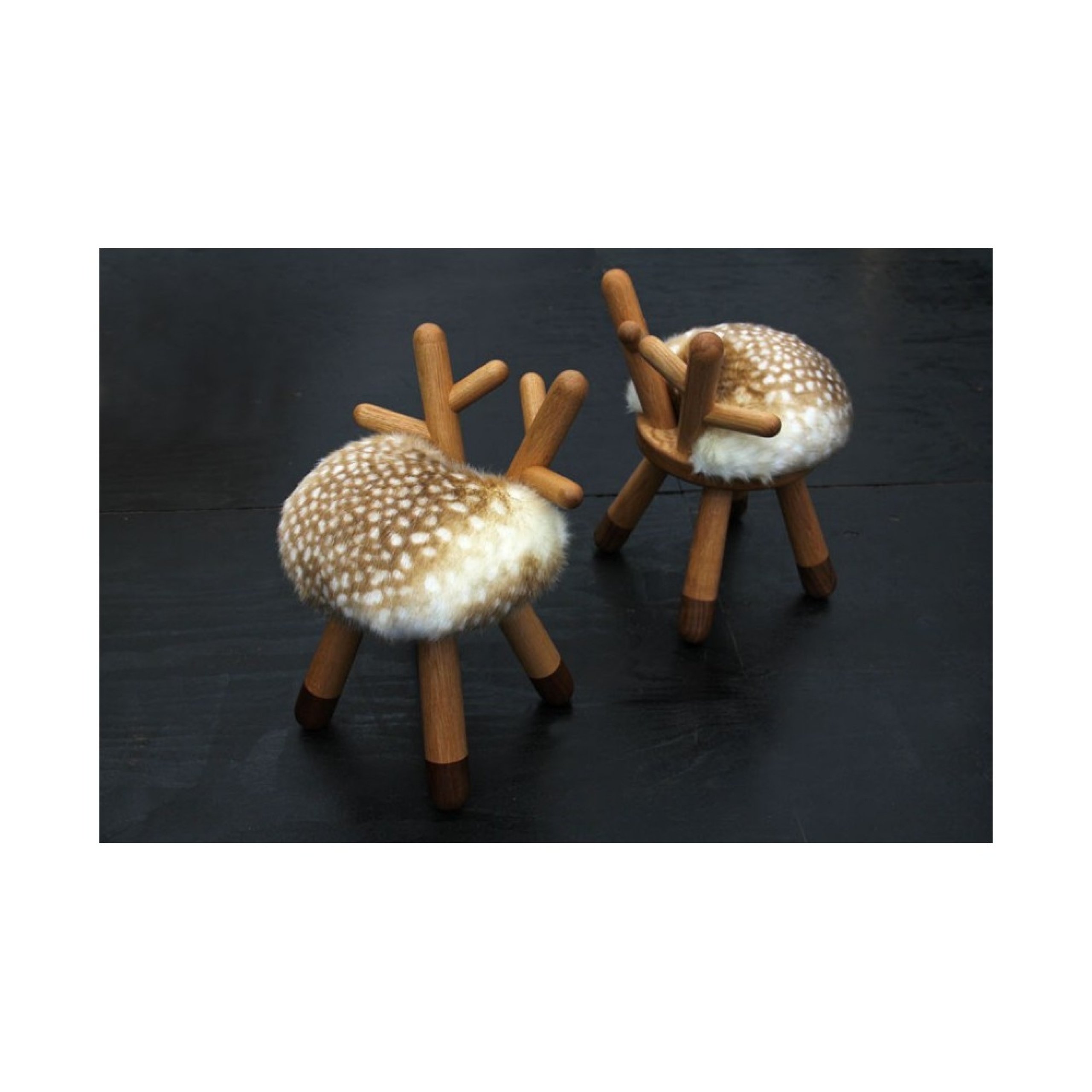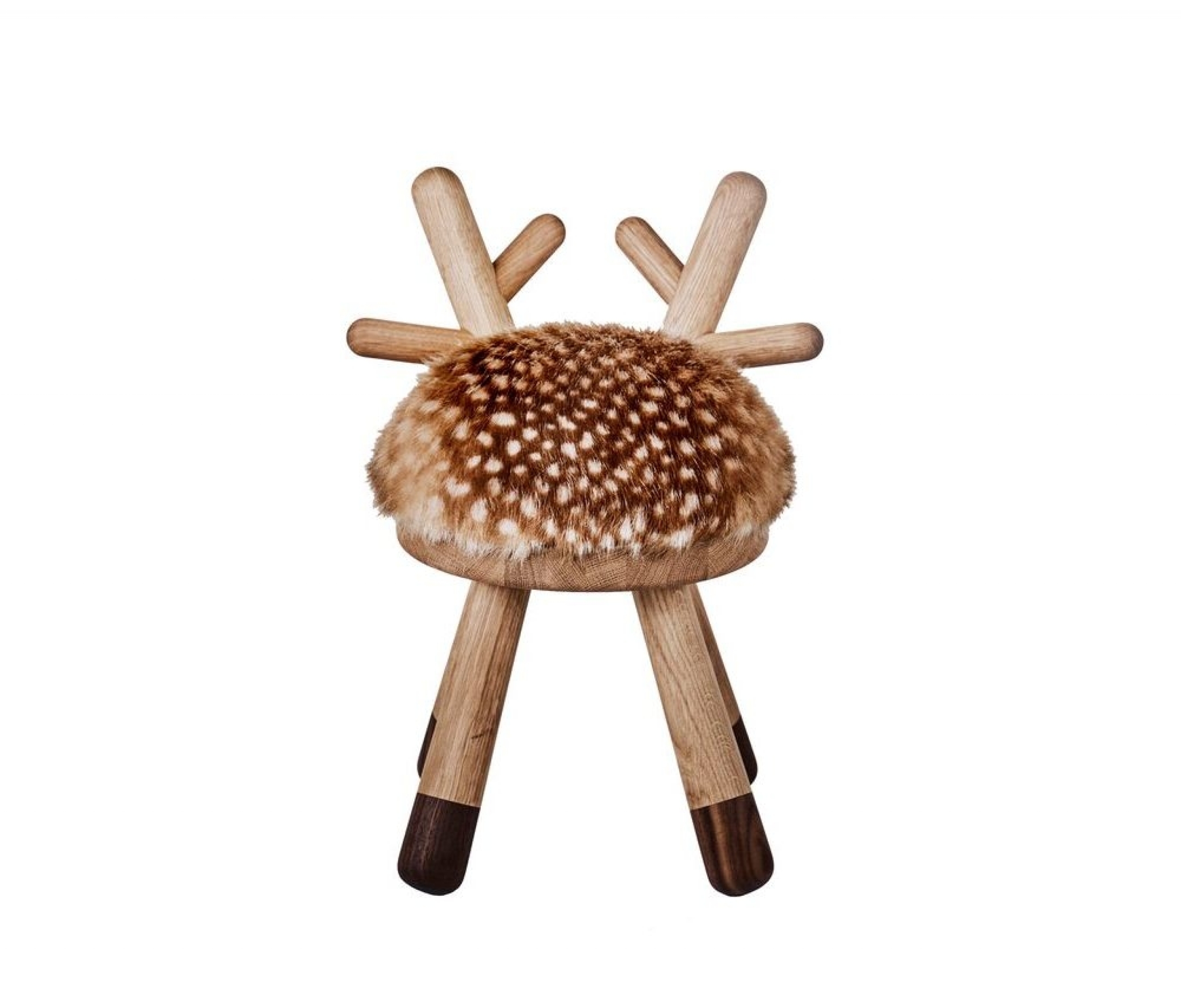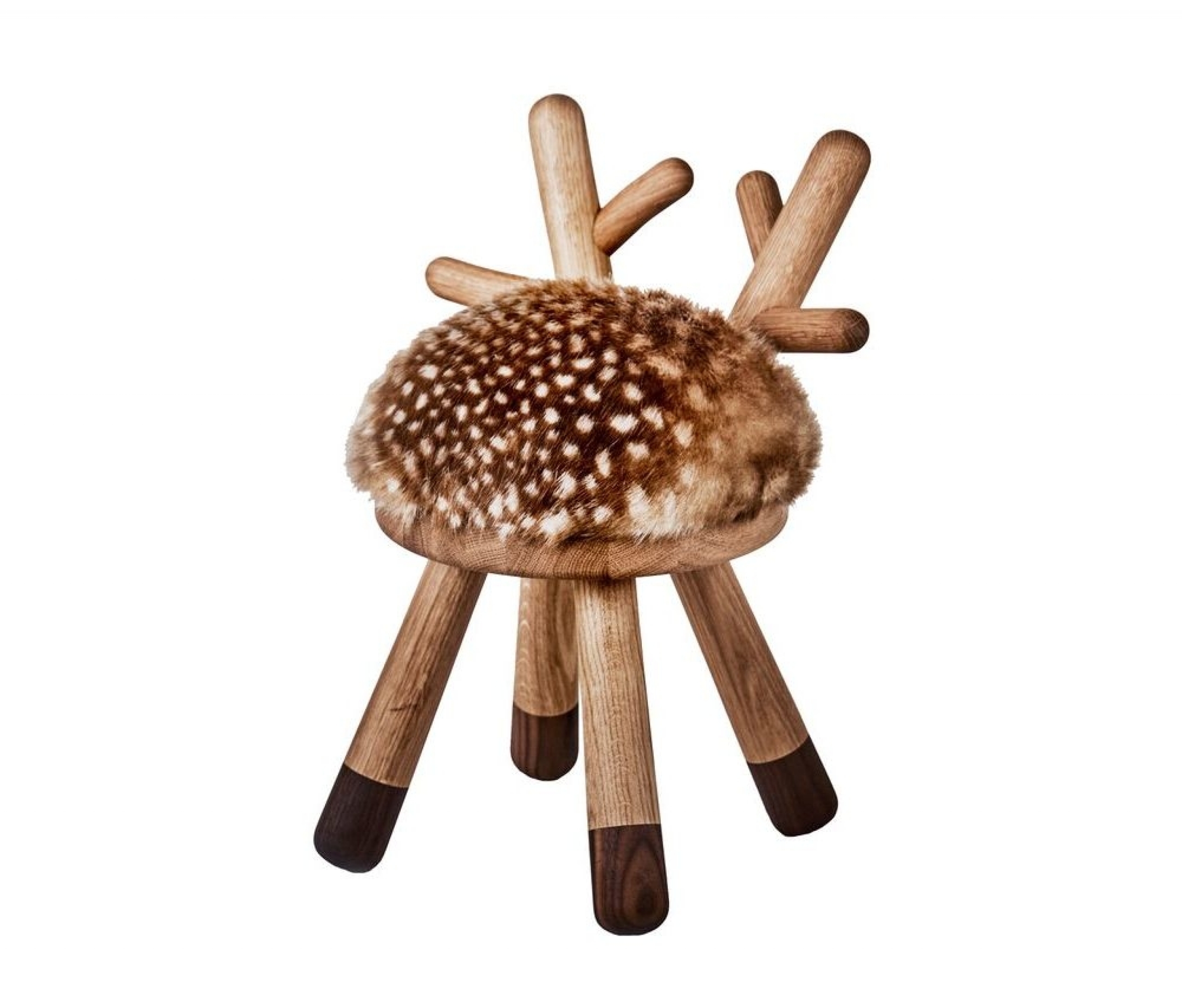 The back of the chair is formed like small antlers and the seat is upholstered with faux fur including the small white dots giving it its characteristic appearance.