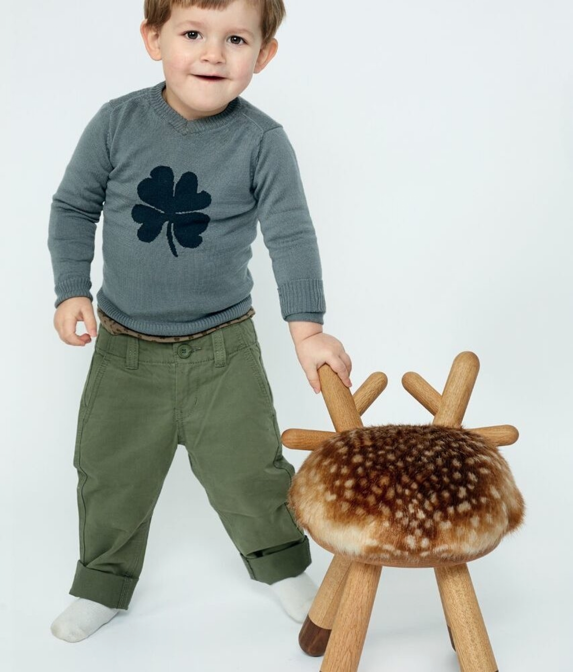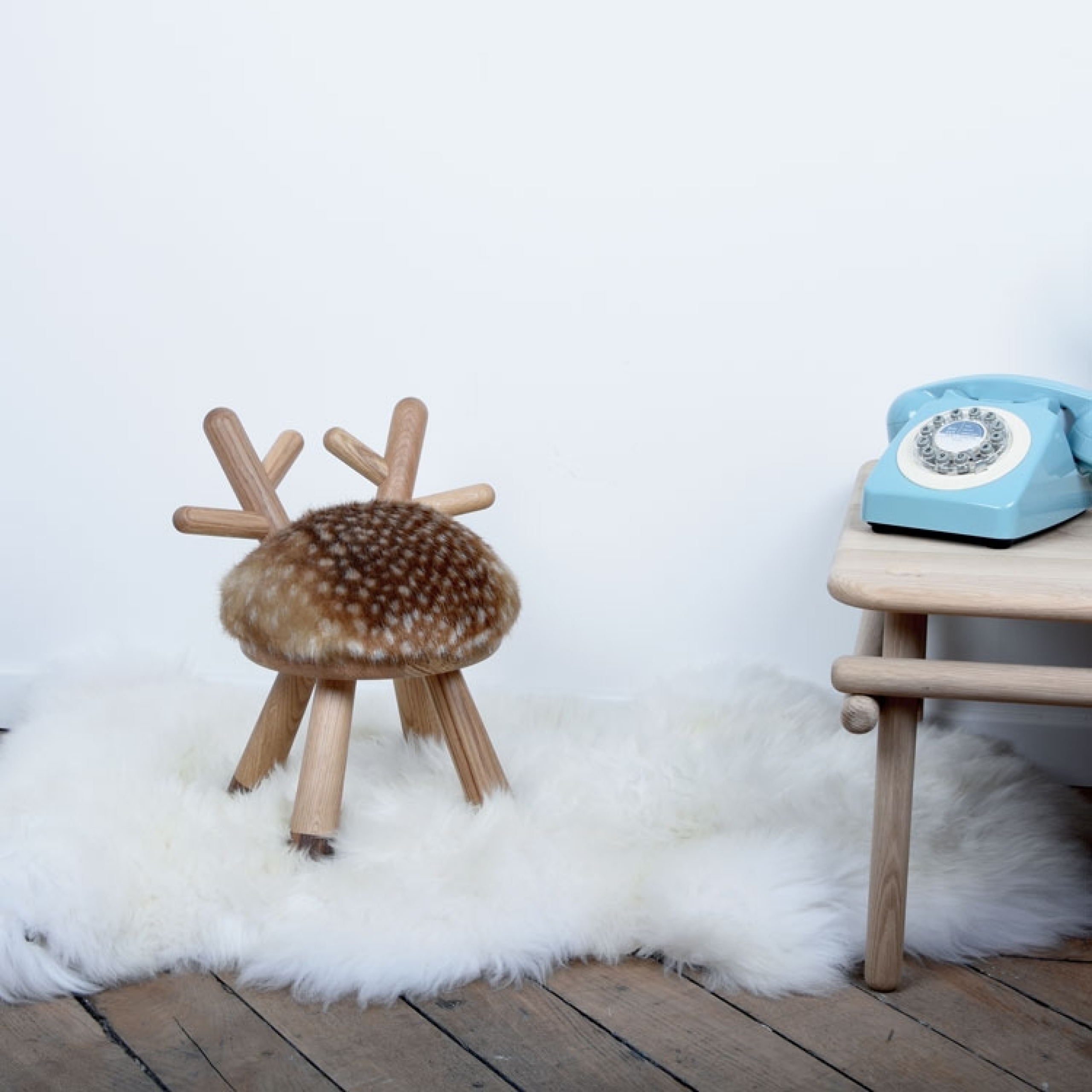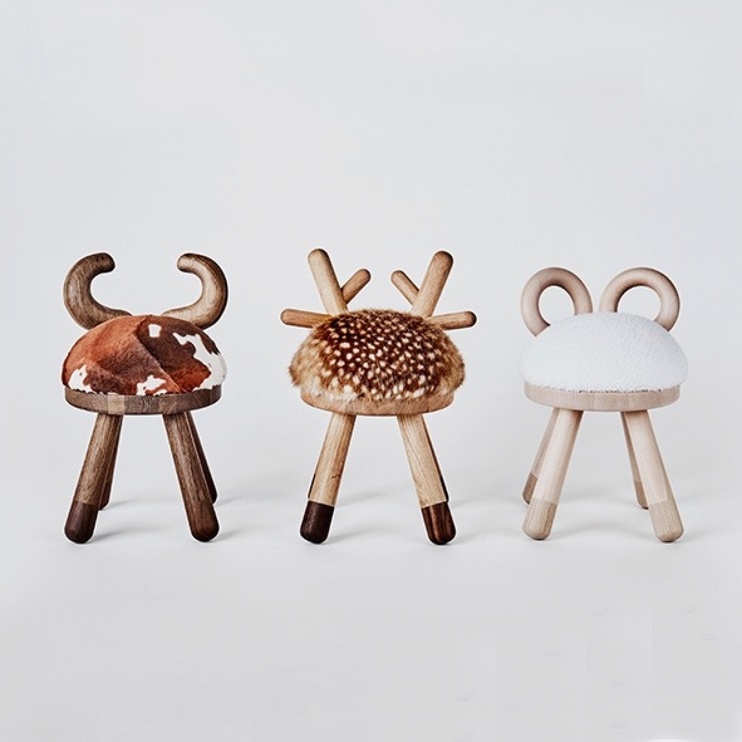 The back of the chair is formed like small antlers and the seat is upholstered with faux fur including the small white dots giving it its characteristic appearance.