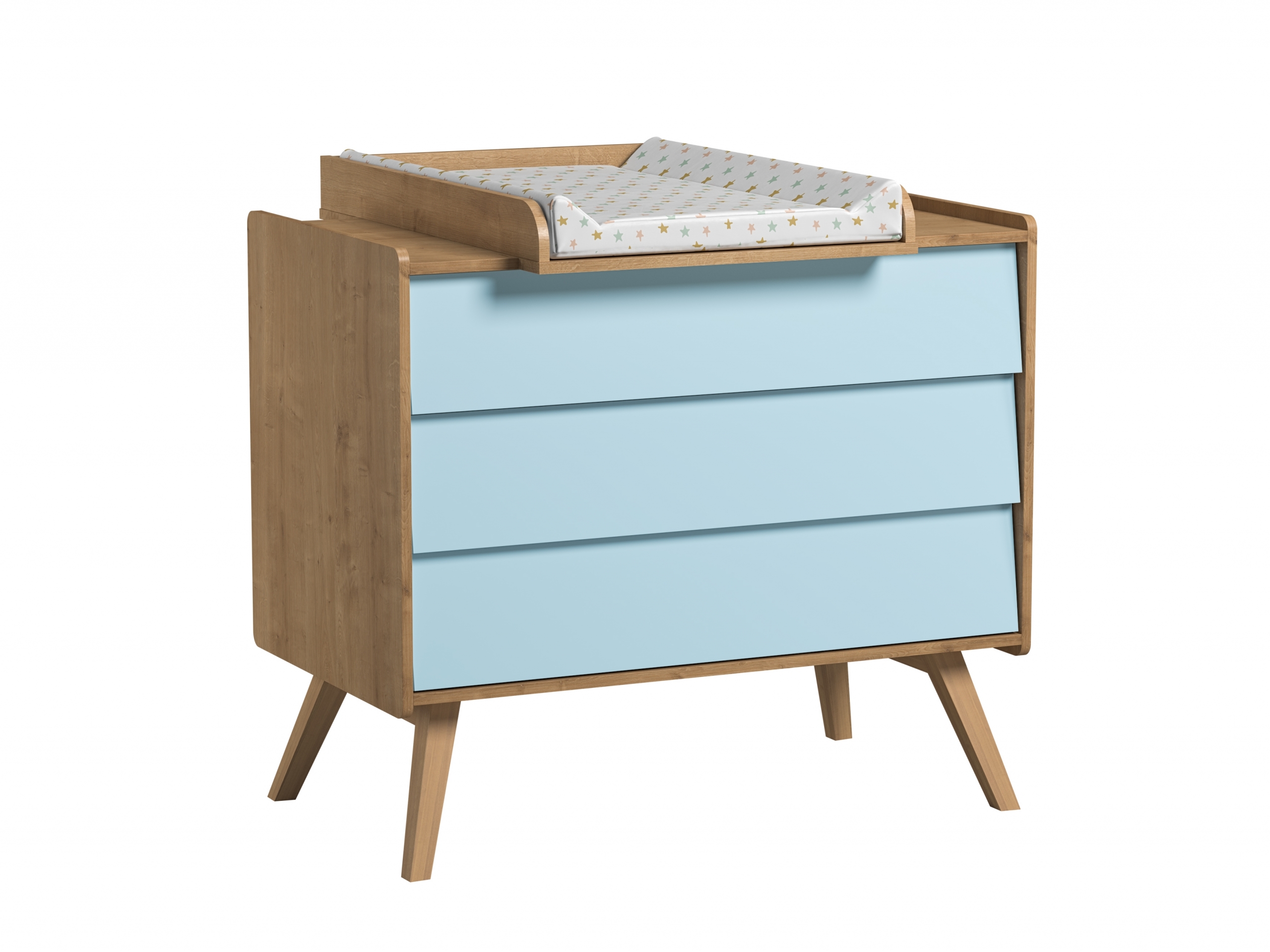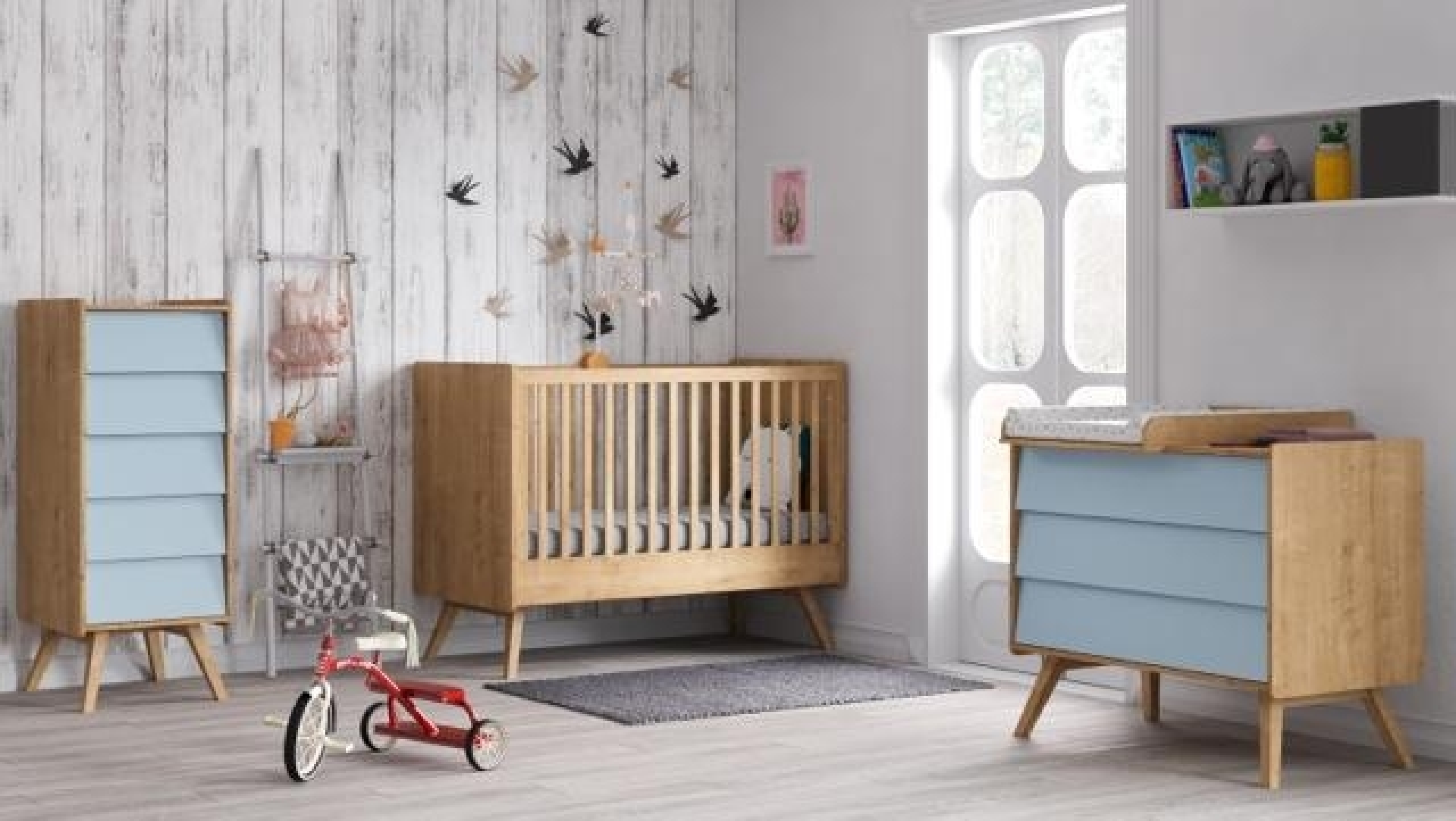 The wood and blue colour are reminiscent of Scandinavian design while the bed and the dresser are designed to be transformed in the course of your child's growth.