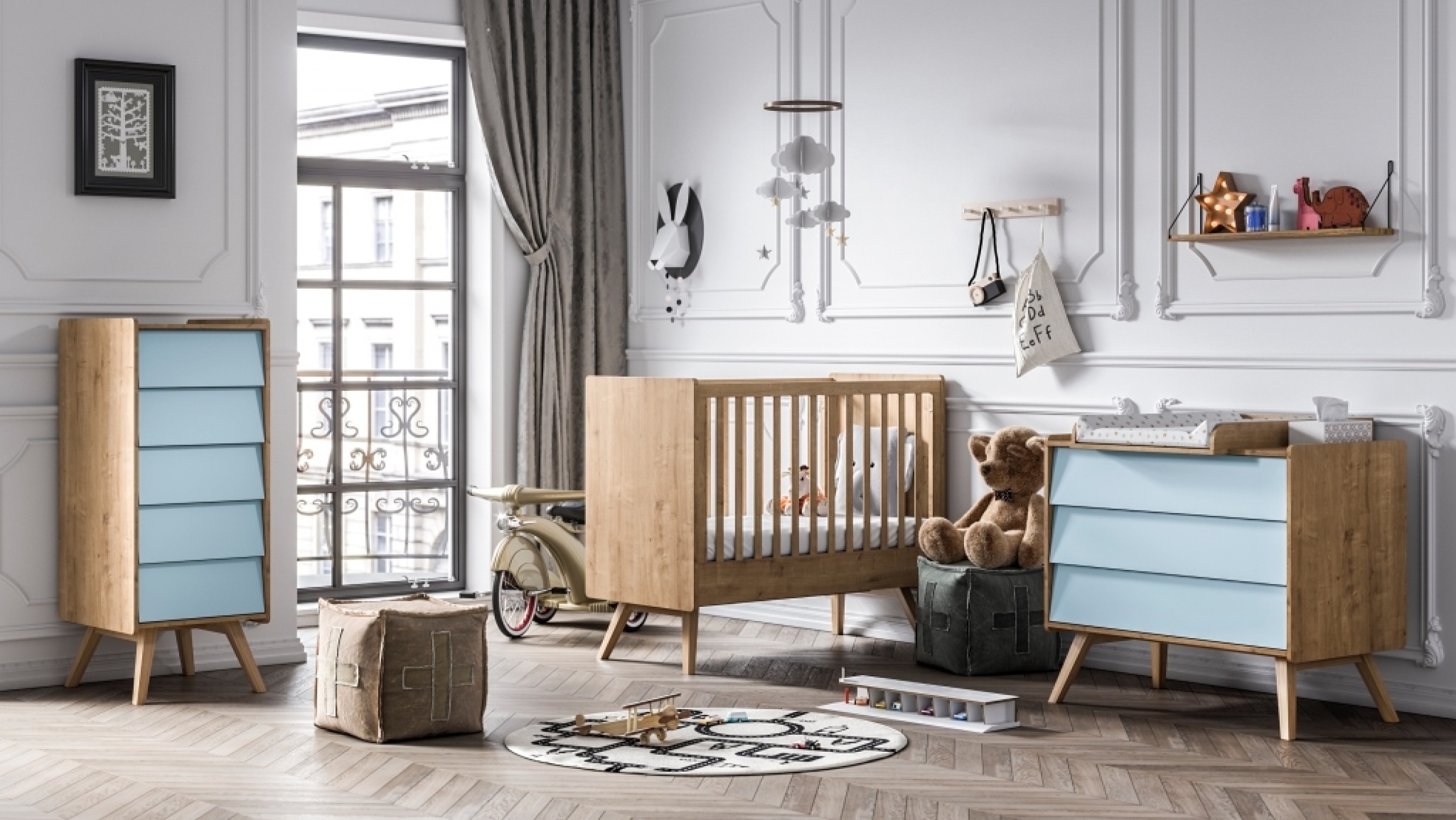 The wood and blue colour are reminiscent of Scandinavian design while the bed and the dresser are designed to be transformed in the course of your child's growth.