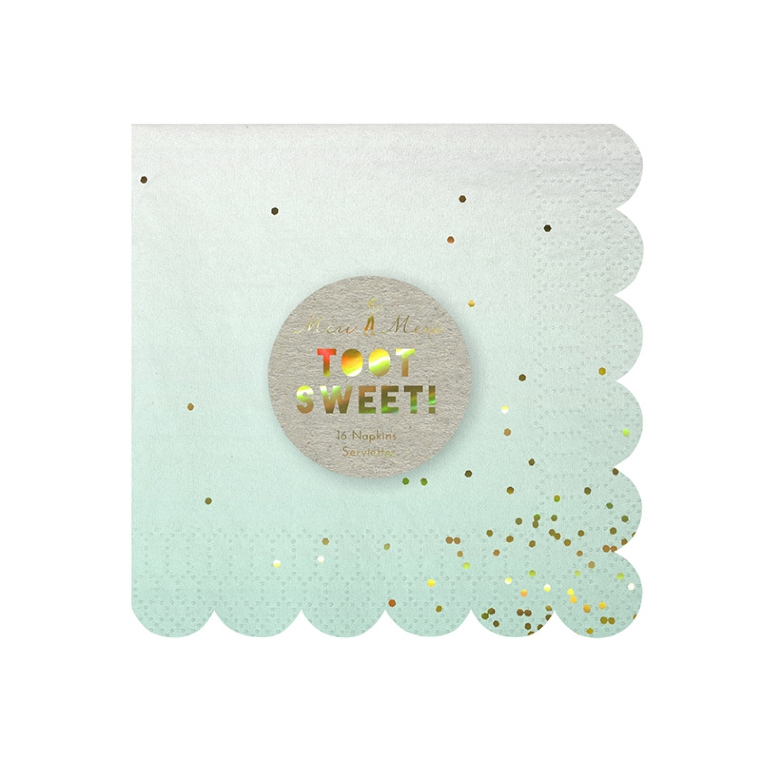 A pack of stylish party napkins with a graduated color scheme. Each napkin is embellished with shiny gold foil and is finished with a scolloped edge.