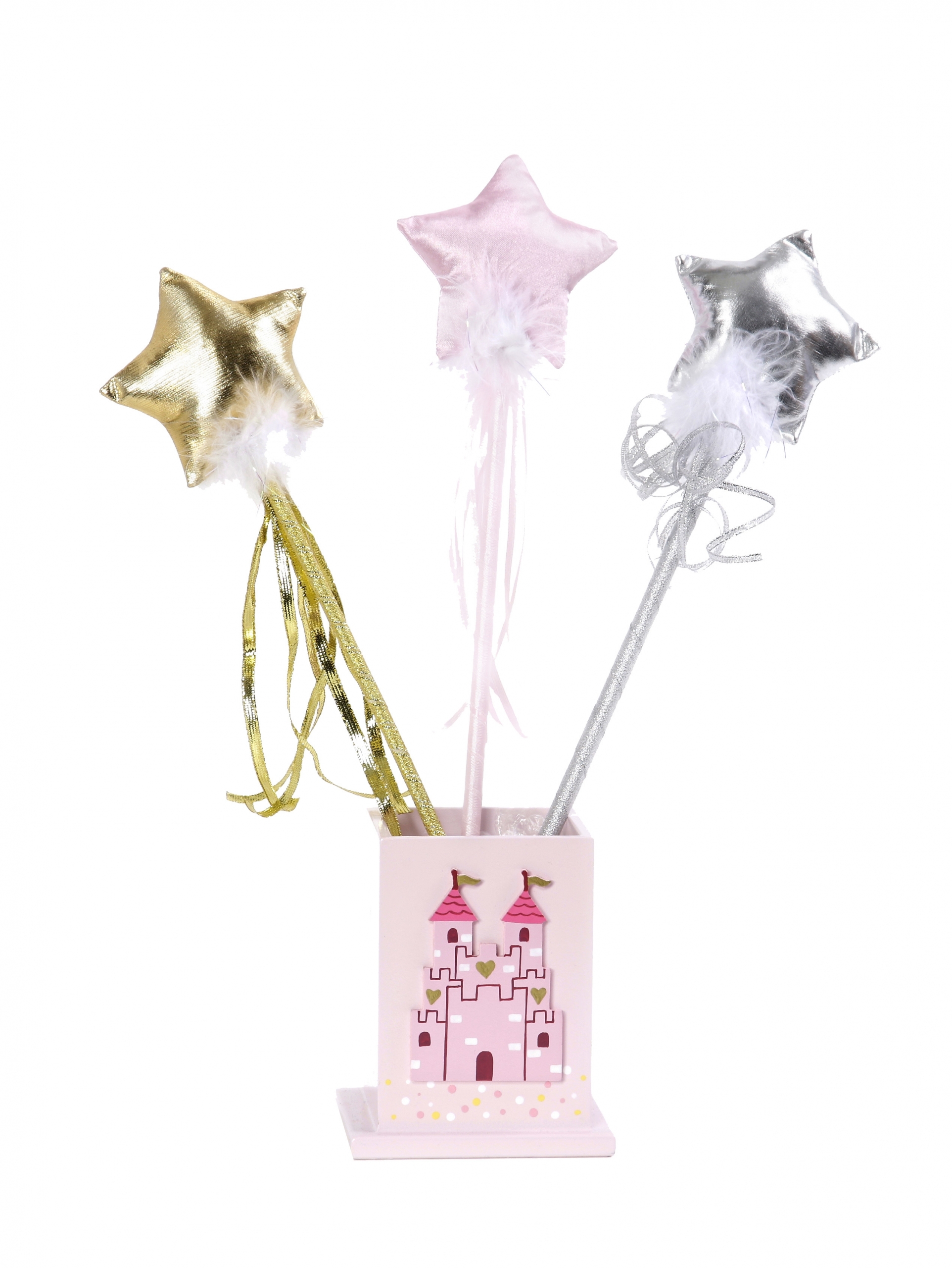 Ces jolies baguettes magiques en forme d'étoile sont en satin argent, or ou rose avec des plumes blanches et de jolis rubans de satin. Elles sont montées sur une baguette enveloppée de ruban pailleté.