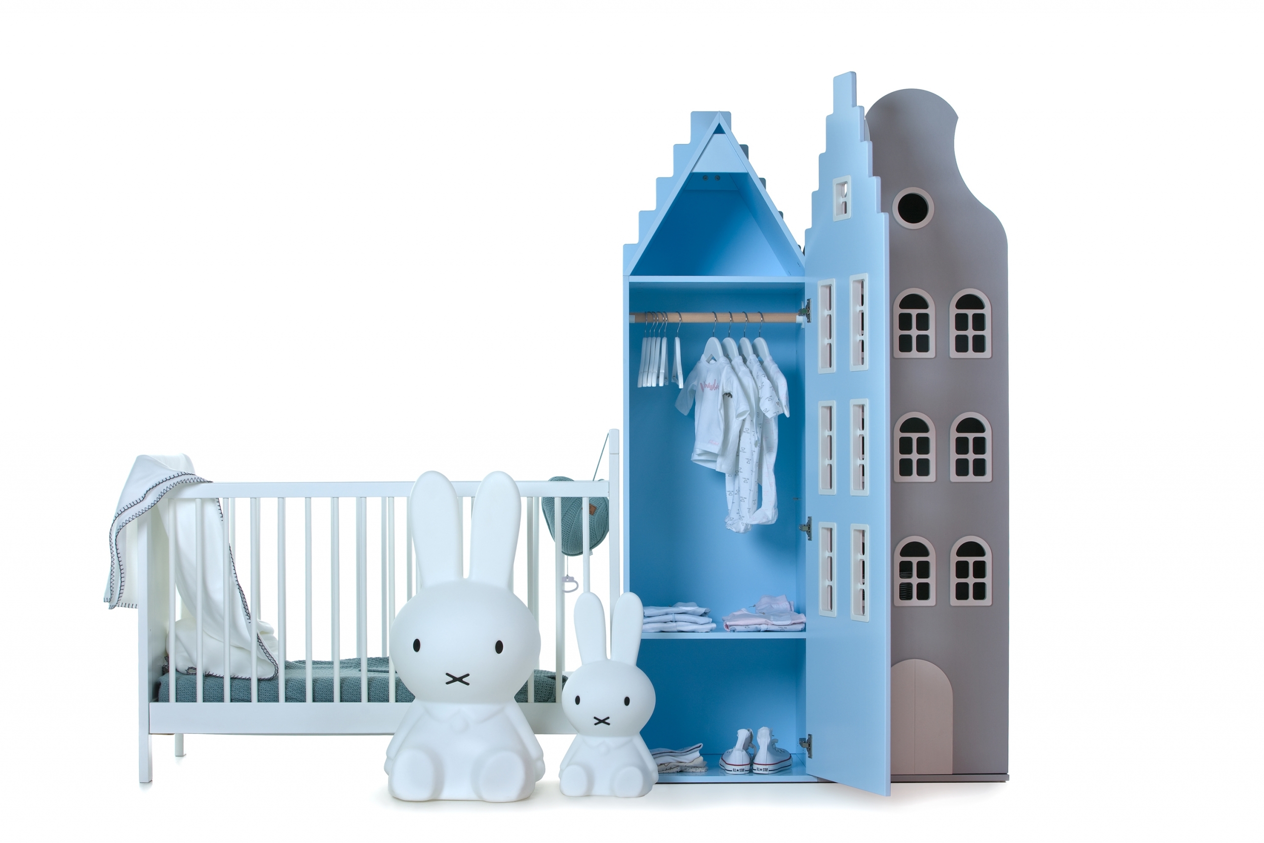 Cette jolie armoire de couleur silver, inspirée de l'architecture hollandaise et imaginée par la marque néerlandaise Kast Van Een Huis est un véritable rêve d'enfant.