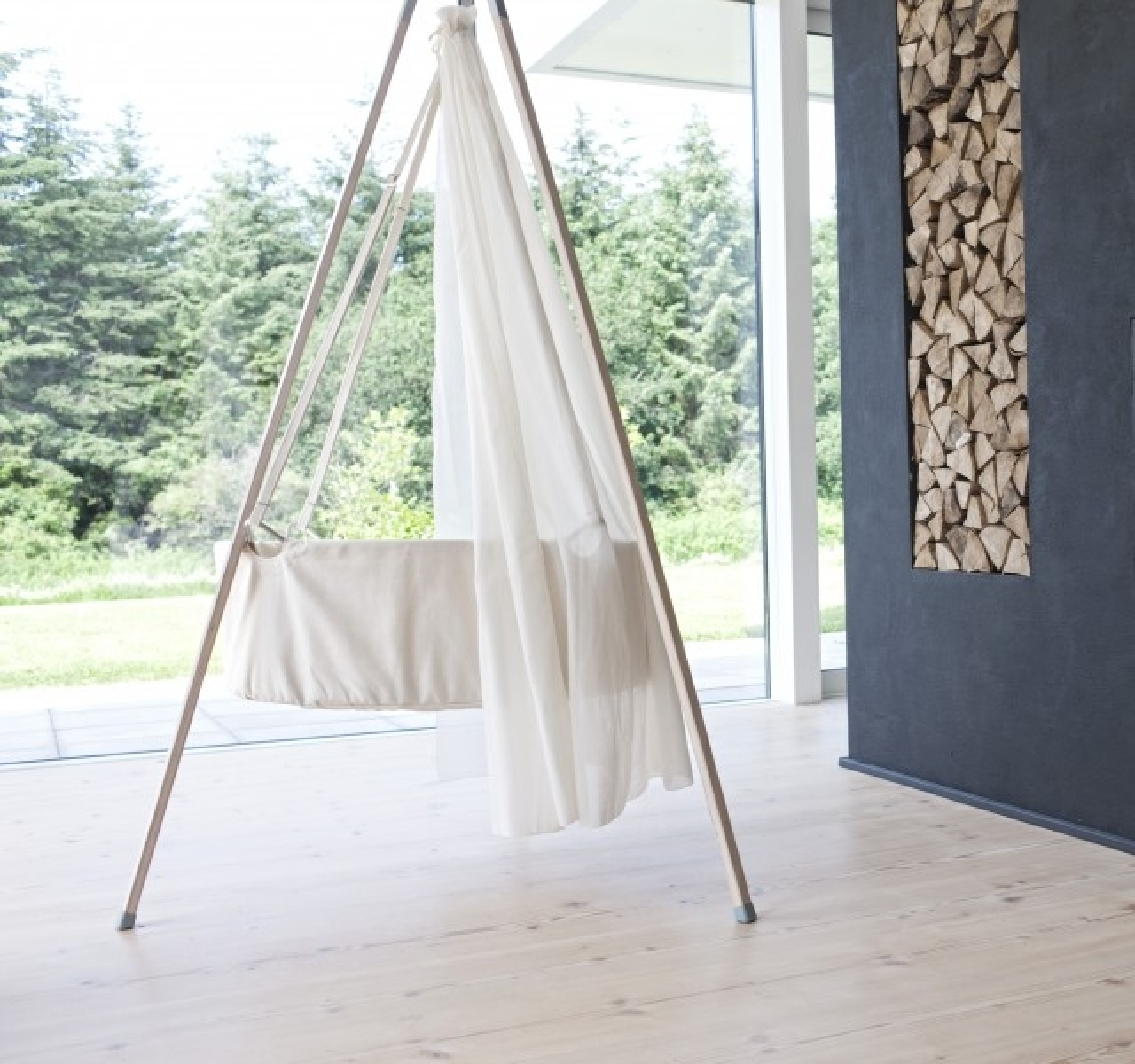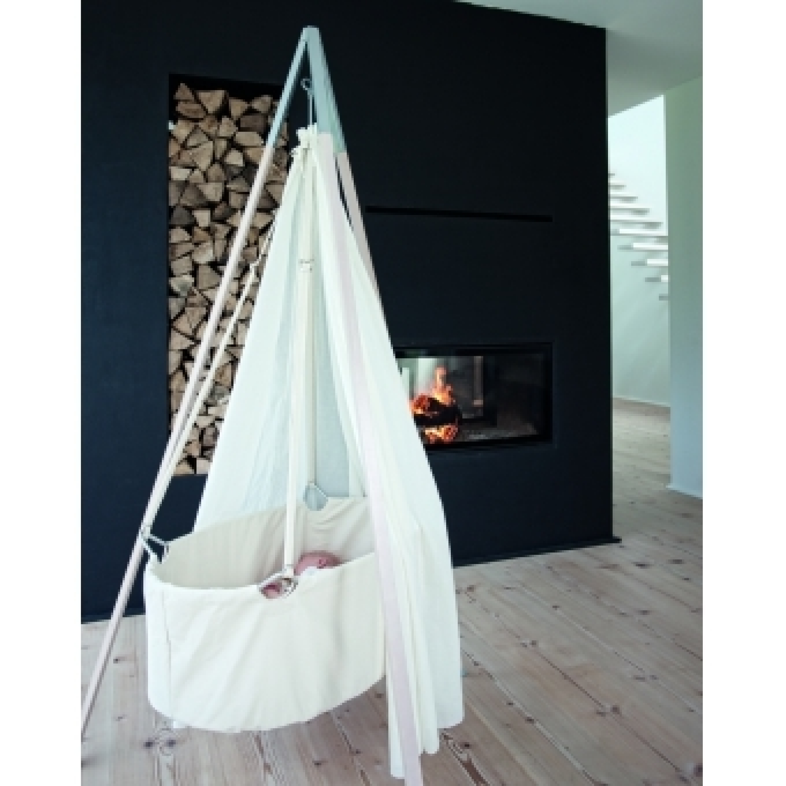 Ce berceau a la particularité de ne pas reposer sur le sol mais d'être suspendu à un trépied par le biais de 4 sangles, il offre ainsi à bébé une liberté de mouvement et de se sentir bercé comme dans le ventre de sa maman.