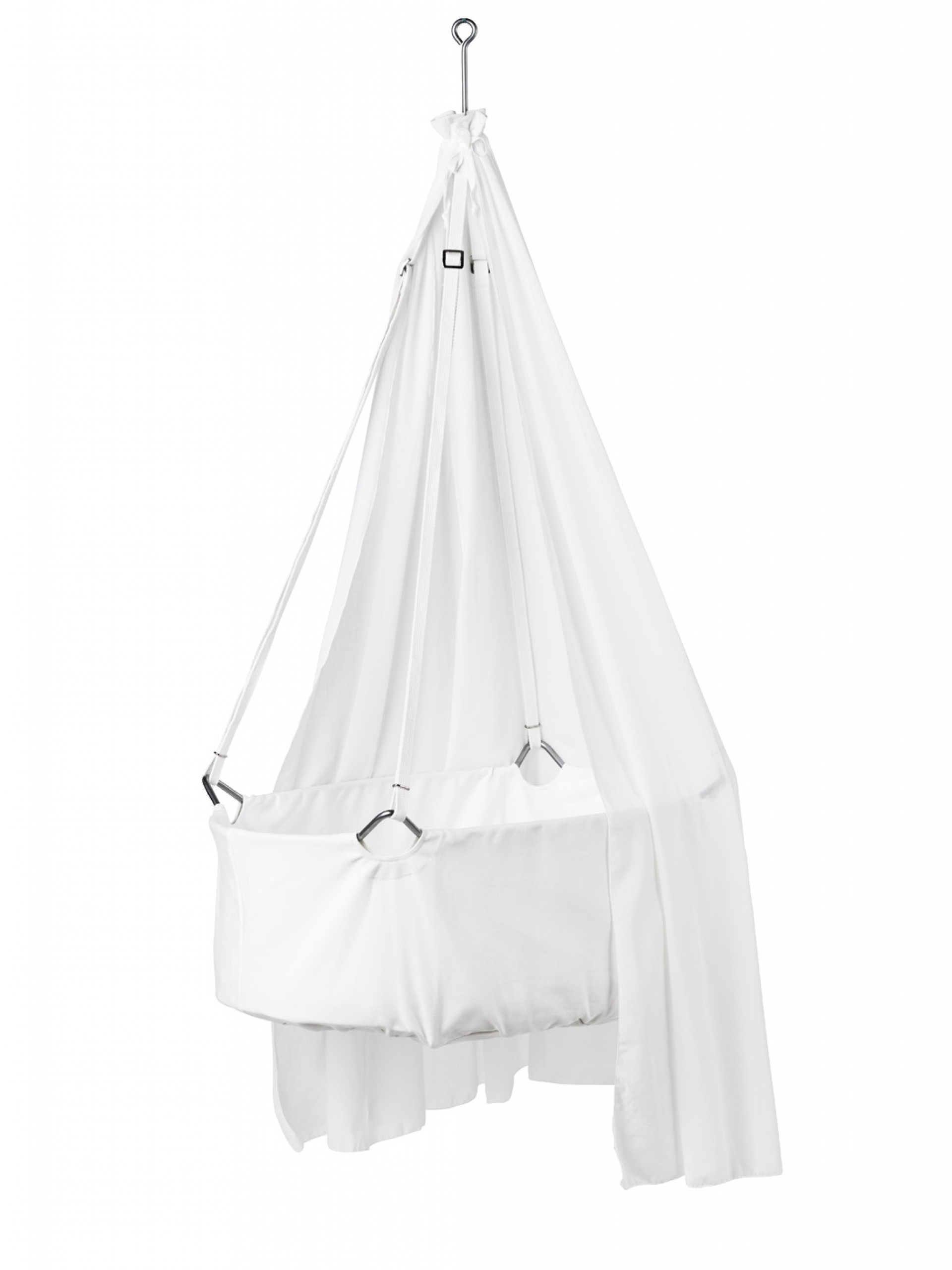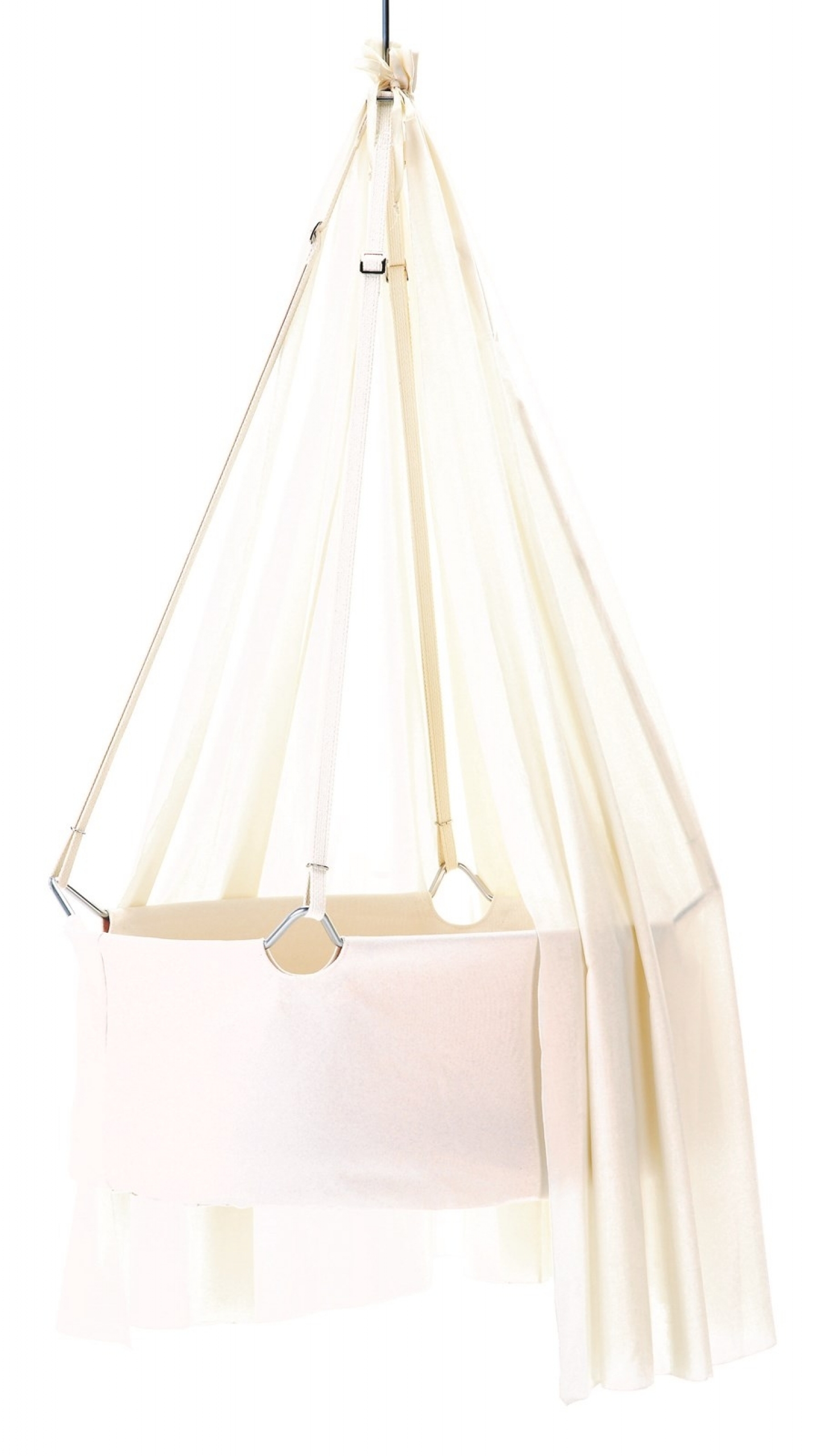 Ce berceau a la particularité de ne pas reposer sur le sol mais d'être suspendu directement au plafond par le biais de 4 sangles, il offre ainsi à bébé une liberté de mouvement et de se sentir bercé comme dans le ventre de sa maman.