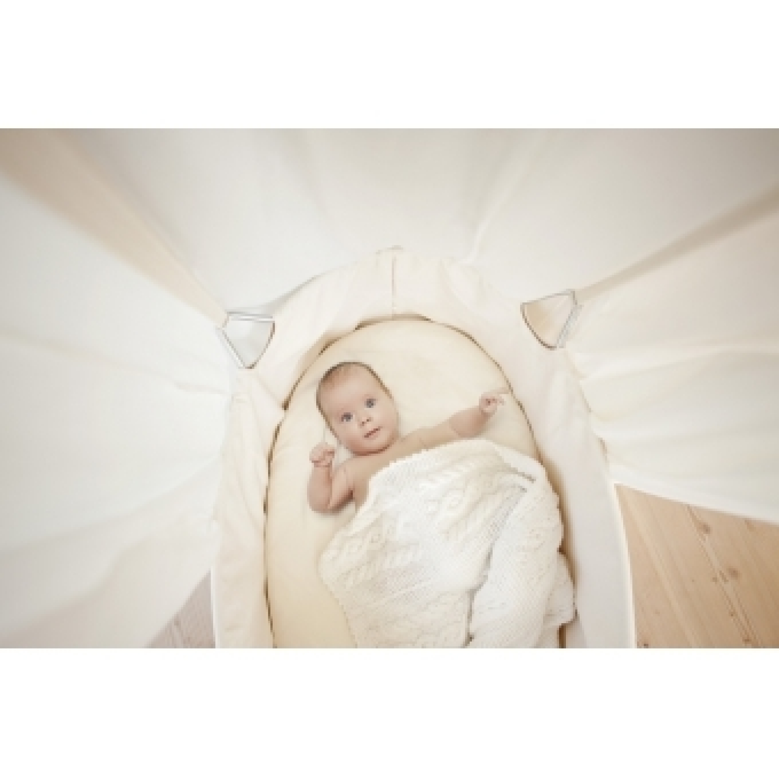 Ce berceau a la particularité de ne pas reposer sur le sol mais d'être suspendu à un trépied par le biais de 4 sangles, il offre ainsi à bébé une liberté de mouvement et de se sentir bercé comme dans le ventre de sa maman.