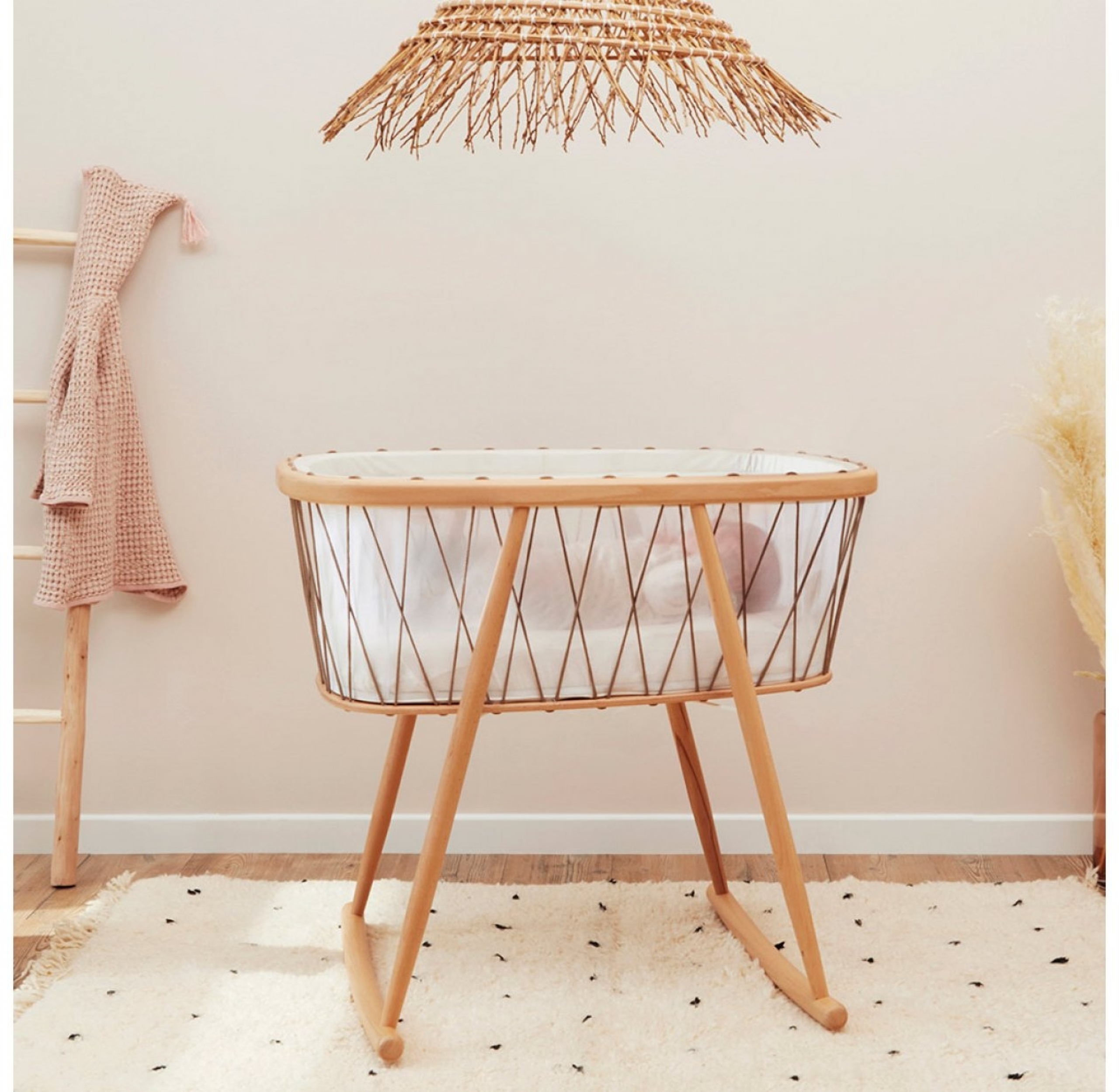 Ce berceau a été pensé pour rassurer votre bébé qui y passera beaucoup de temps les premiers mois de sa vie. Votre bébé sera bercé par le balancement latéral du berceau et s'éveillera au monde avec la délicate transparence du cocon en mesh légère et les lacets.
