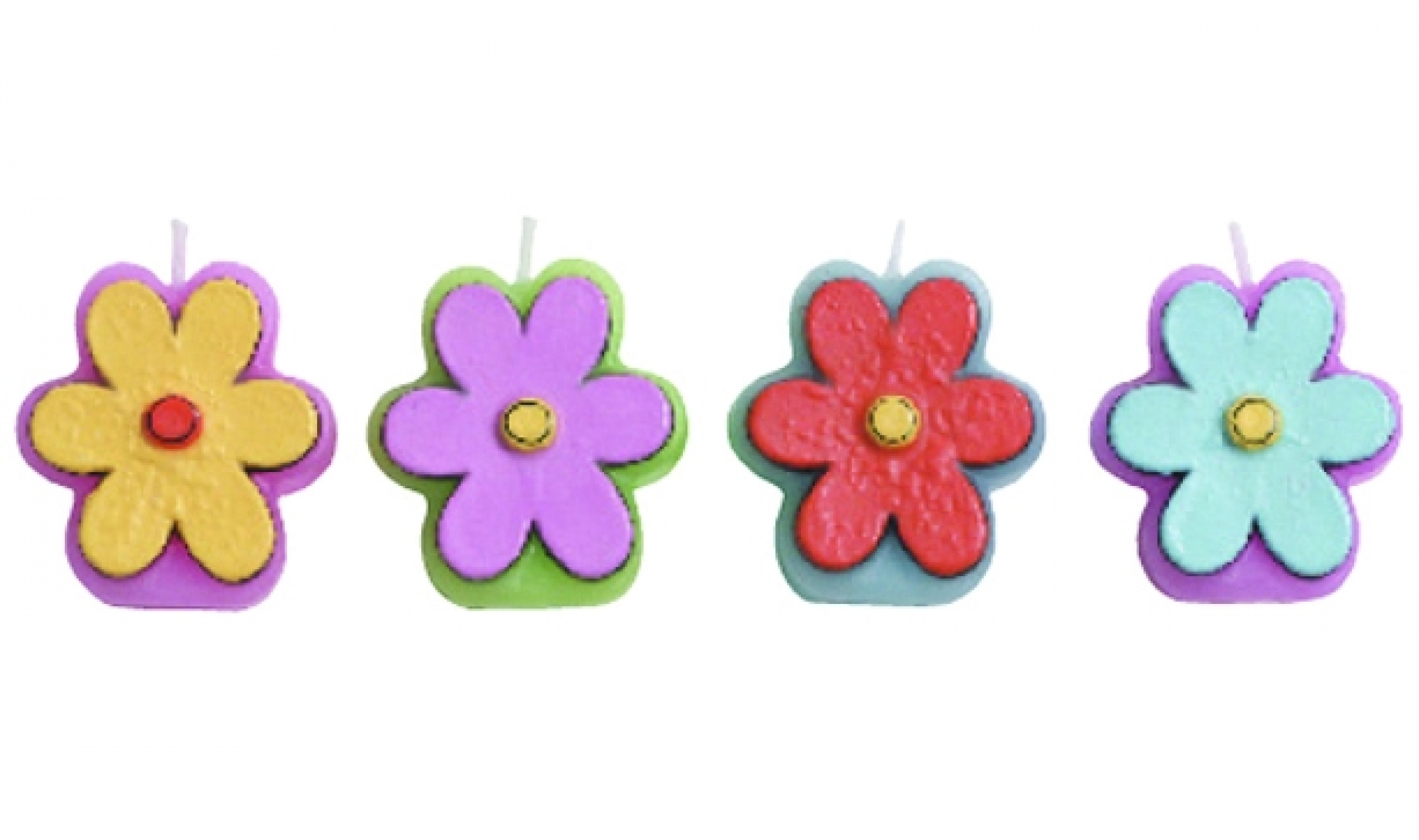 Set de 4 bougies en forme de fleurs multicolores.