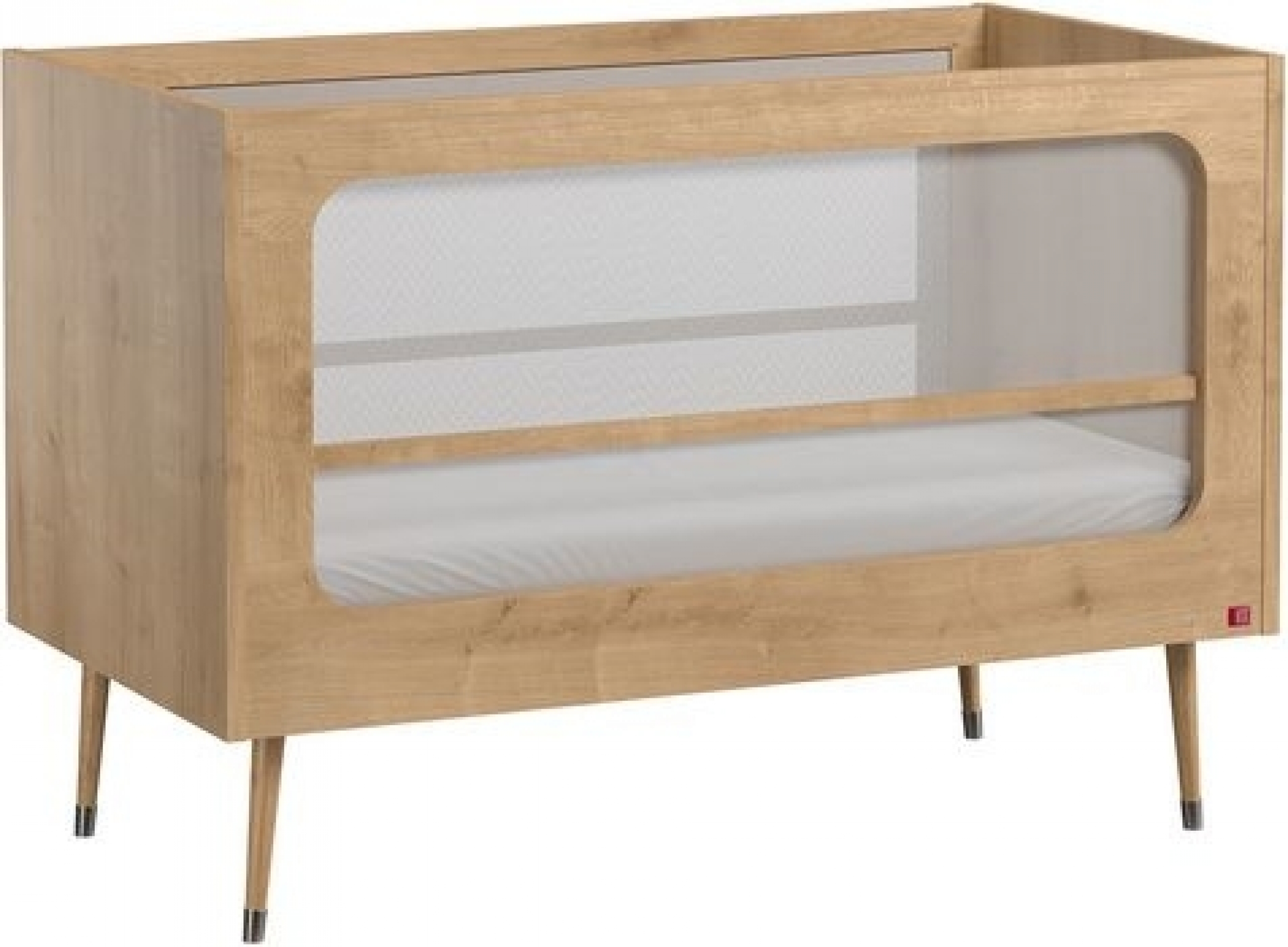 On aime son design rétro avec la forme de son piètement incliné et la présence du métal, sa douce transparence pour mieux surveiller bébé et les couleurs chaudes du bois.