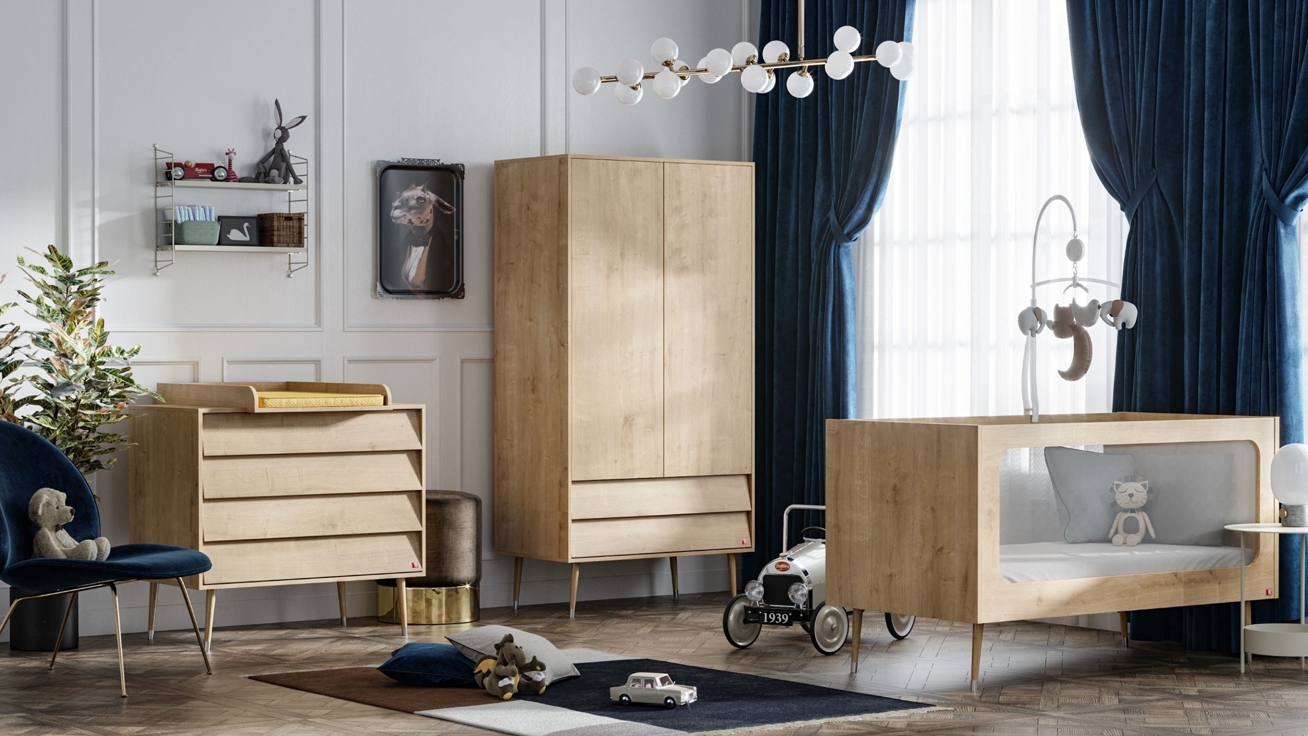 La collection se compose d'un lit bébé (disponible en 2 tailles) coordonné à une commode à langer et d'une armoire (disponible en bois naturel ou bois blanc).