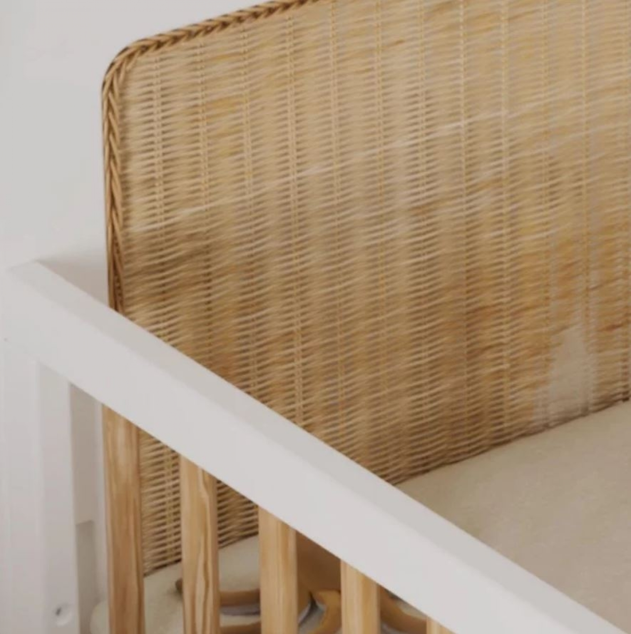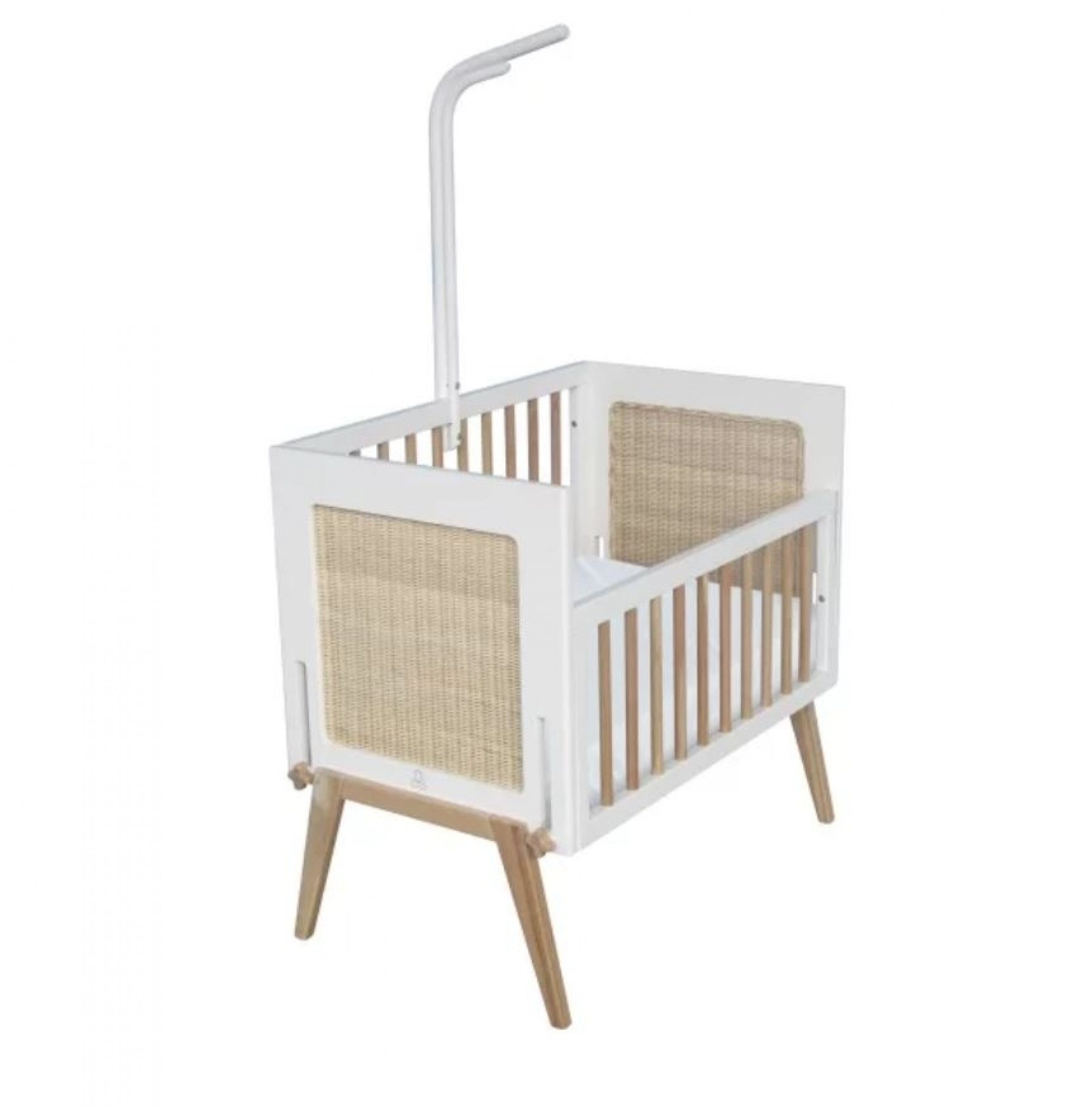 Découvrez ce magnifique berceau Cododo Marélia Neige, imaginé par la marque THEO, alliant du bois massif (cèdre) et un tressage rotin.