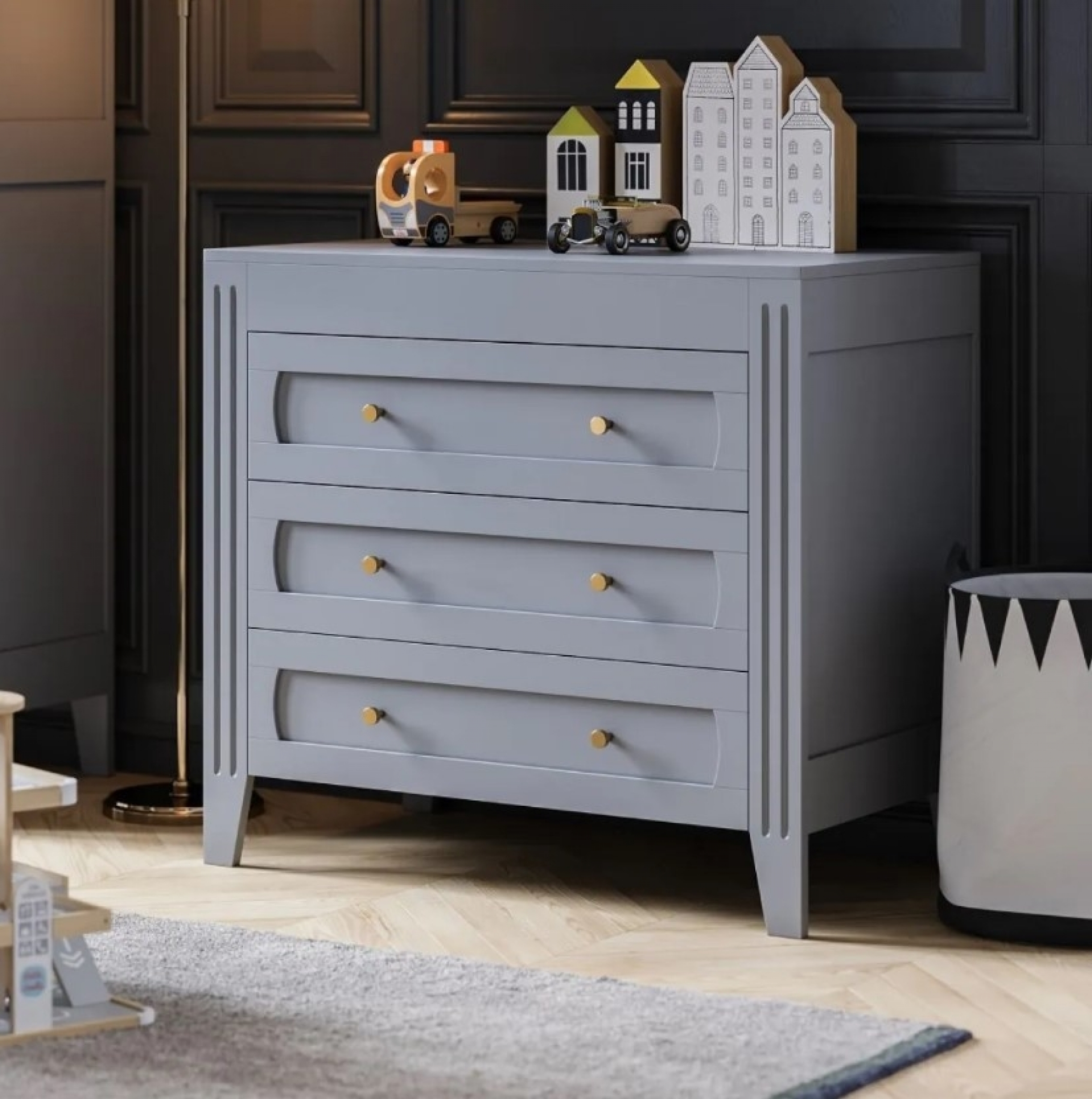 - de la commode Milenne gris clair avec ses 3 larges tiroirs bien pratiques,
