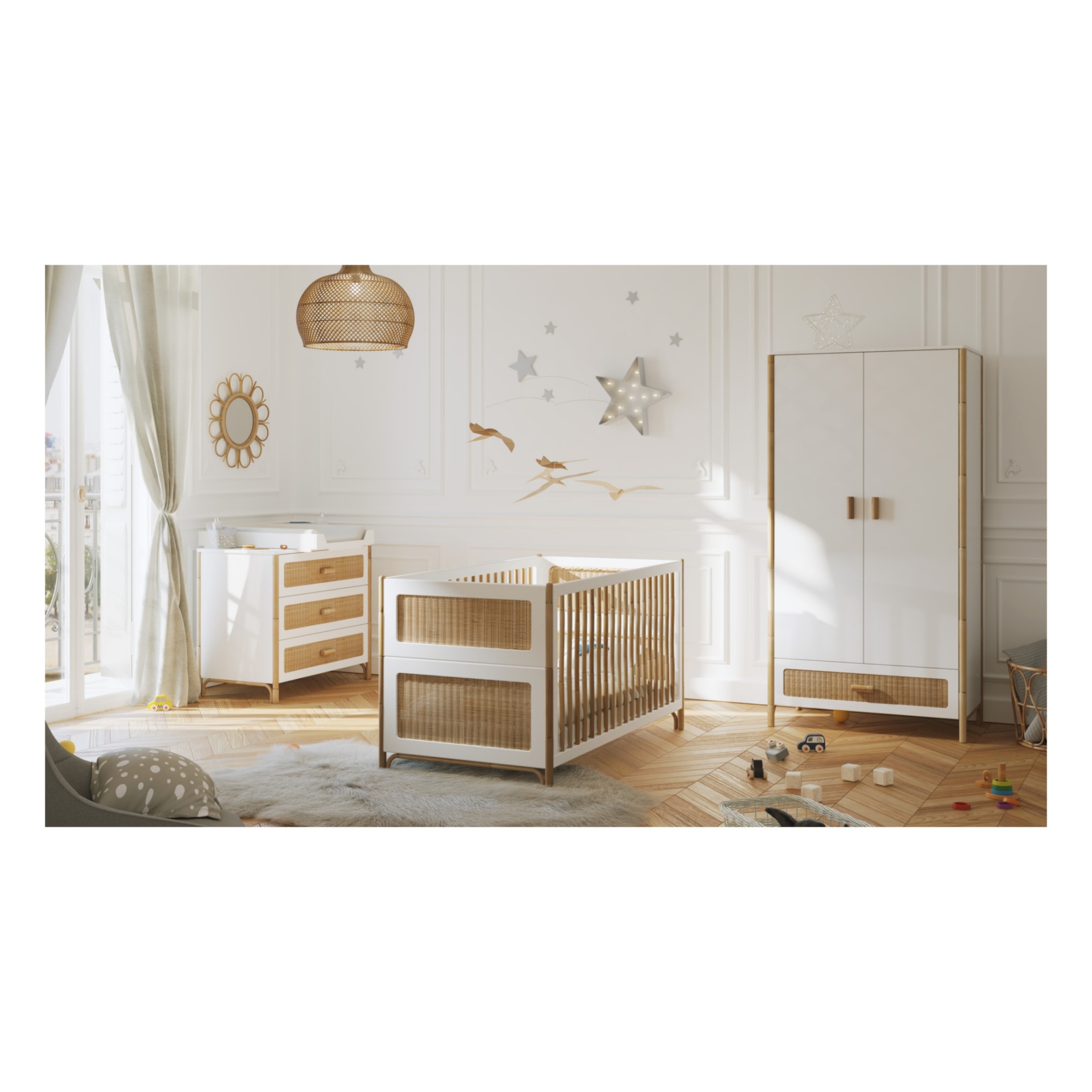 La collection se compose d'un lit bébé (disponible en 2 tailles) ou junior coordonné à une commode, une table à langer et un berceau.