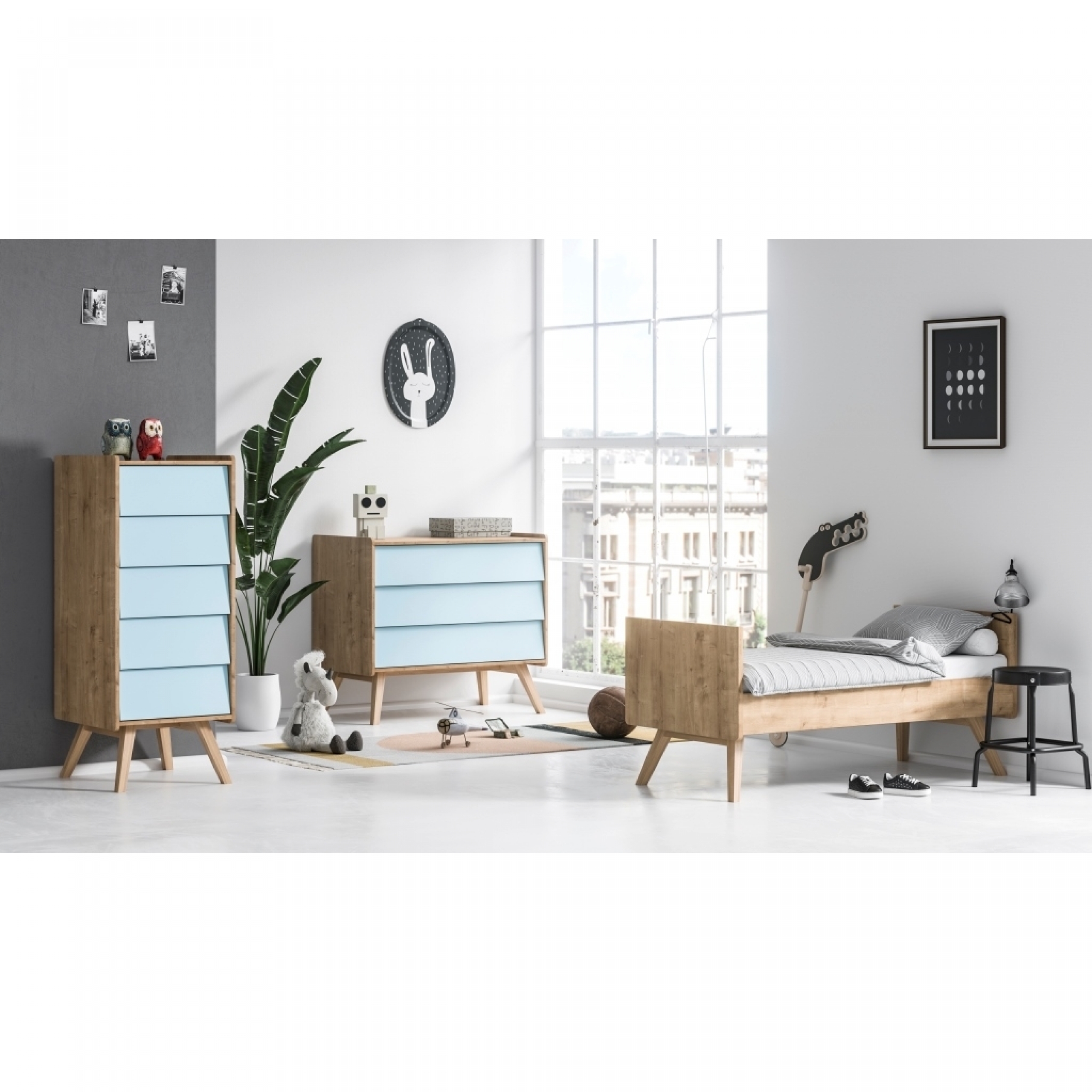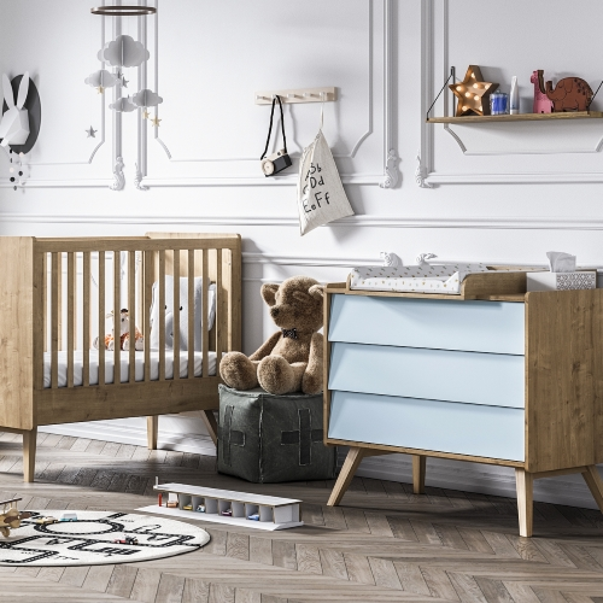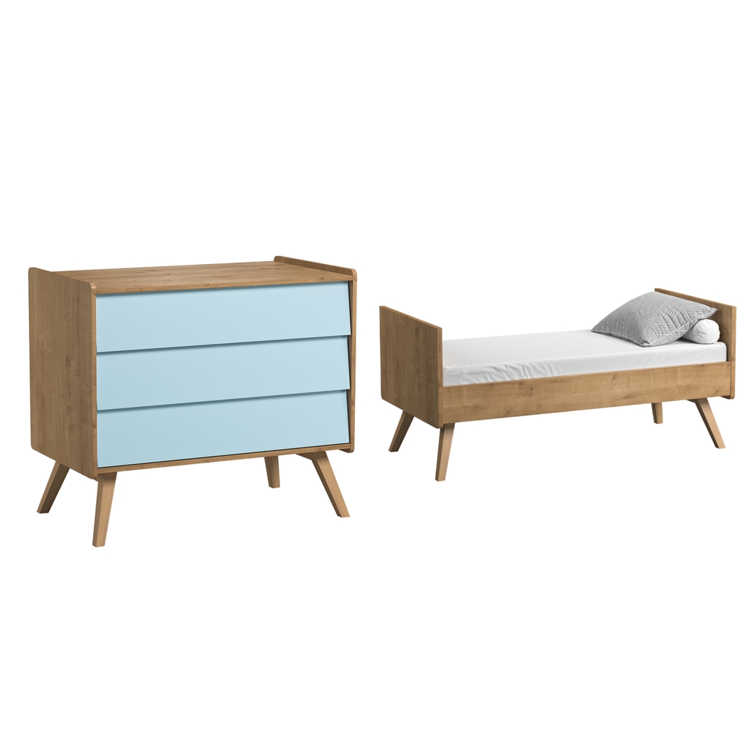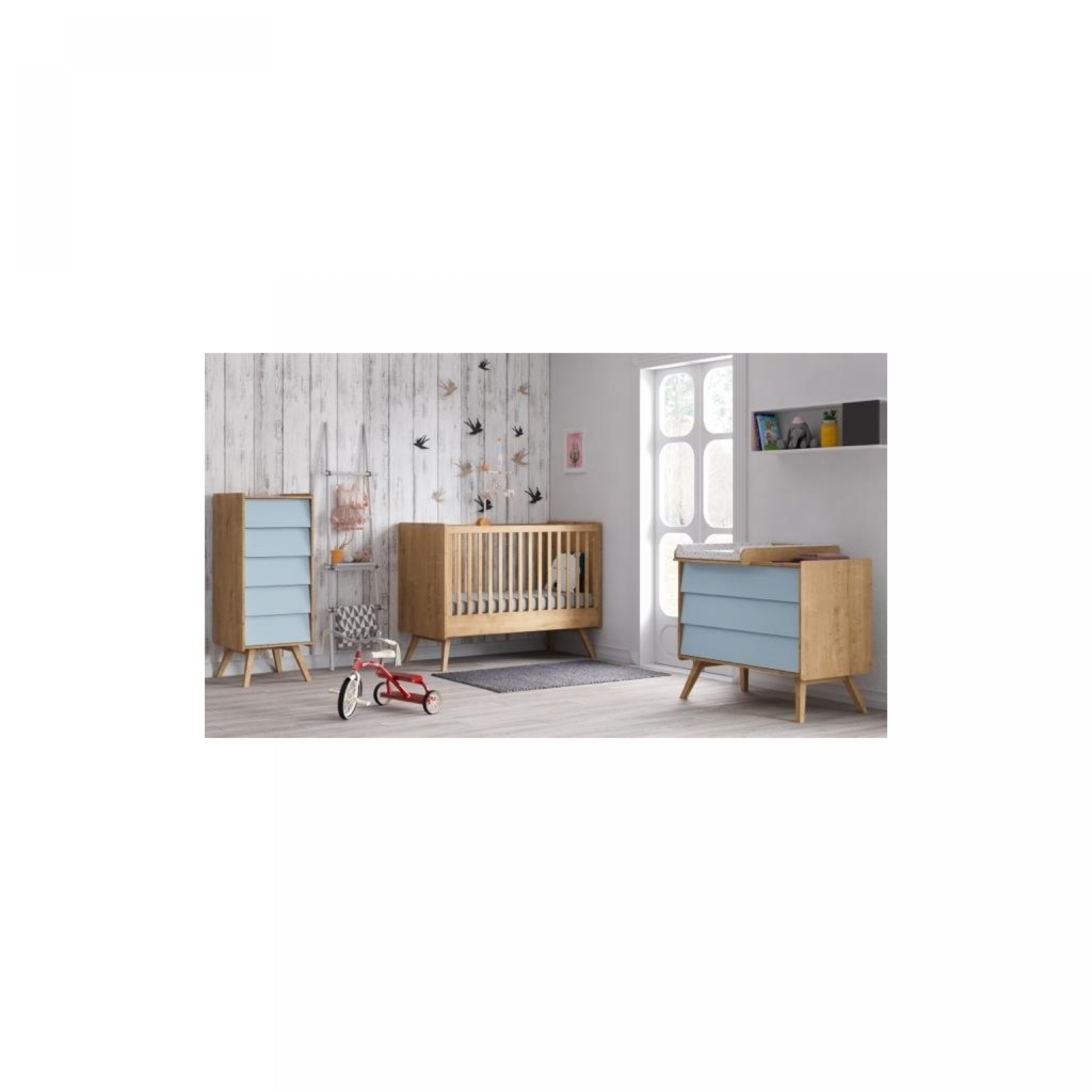 Cette offre se compose du Lit Bébé évolutif Vintage de VOX en 70 x 140 cm ainsi que de la commode à langer assortie couleur bleu et bois naturel (le plan à langer amovible est aussi inclus dans le pack).