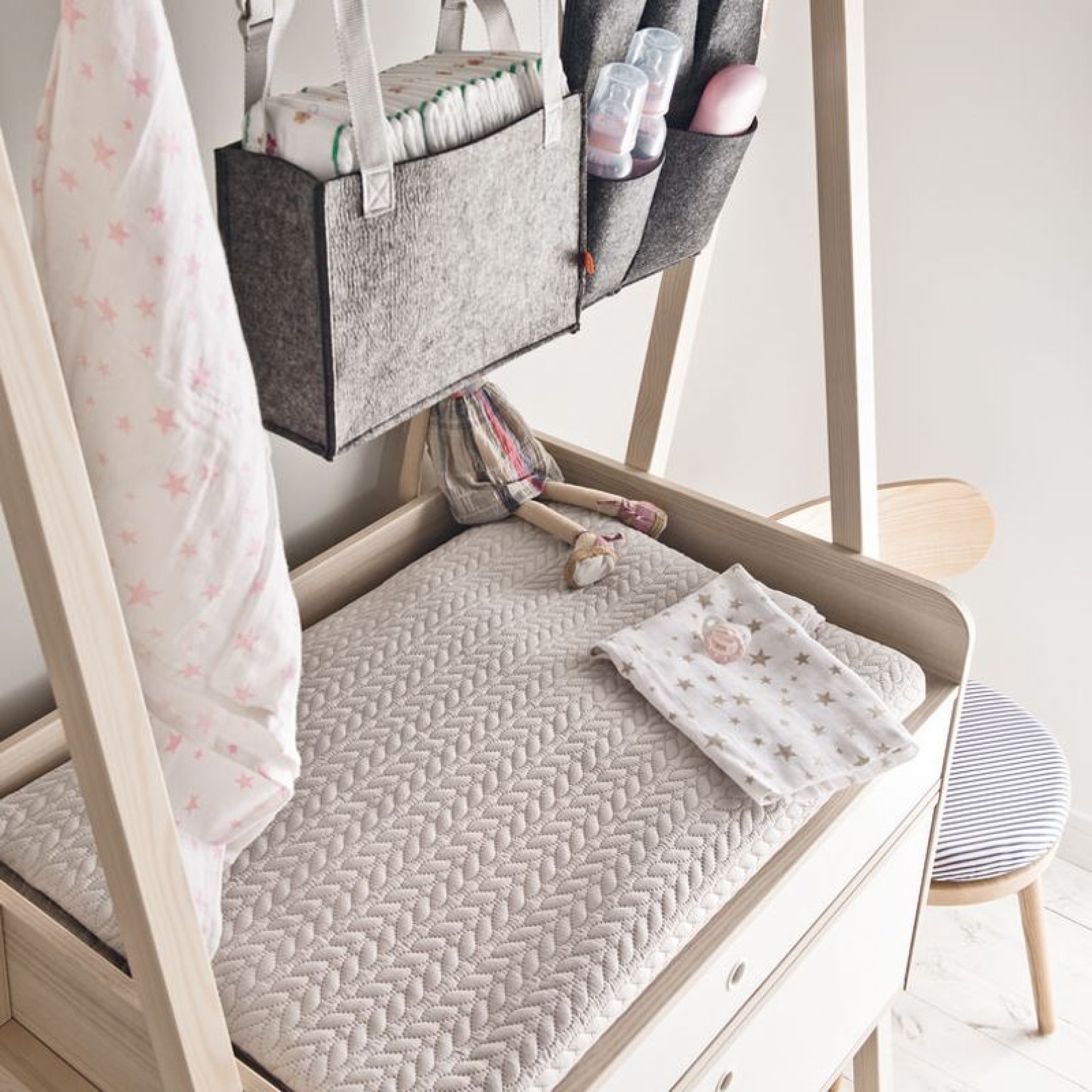 Voici le rangement idéal pour avoir tout le nécessaire de bébé à portée de main. Ce cabas en feutre gris est à associer à la commode Spot.
