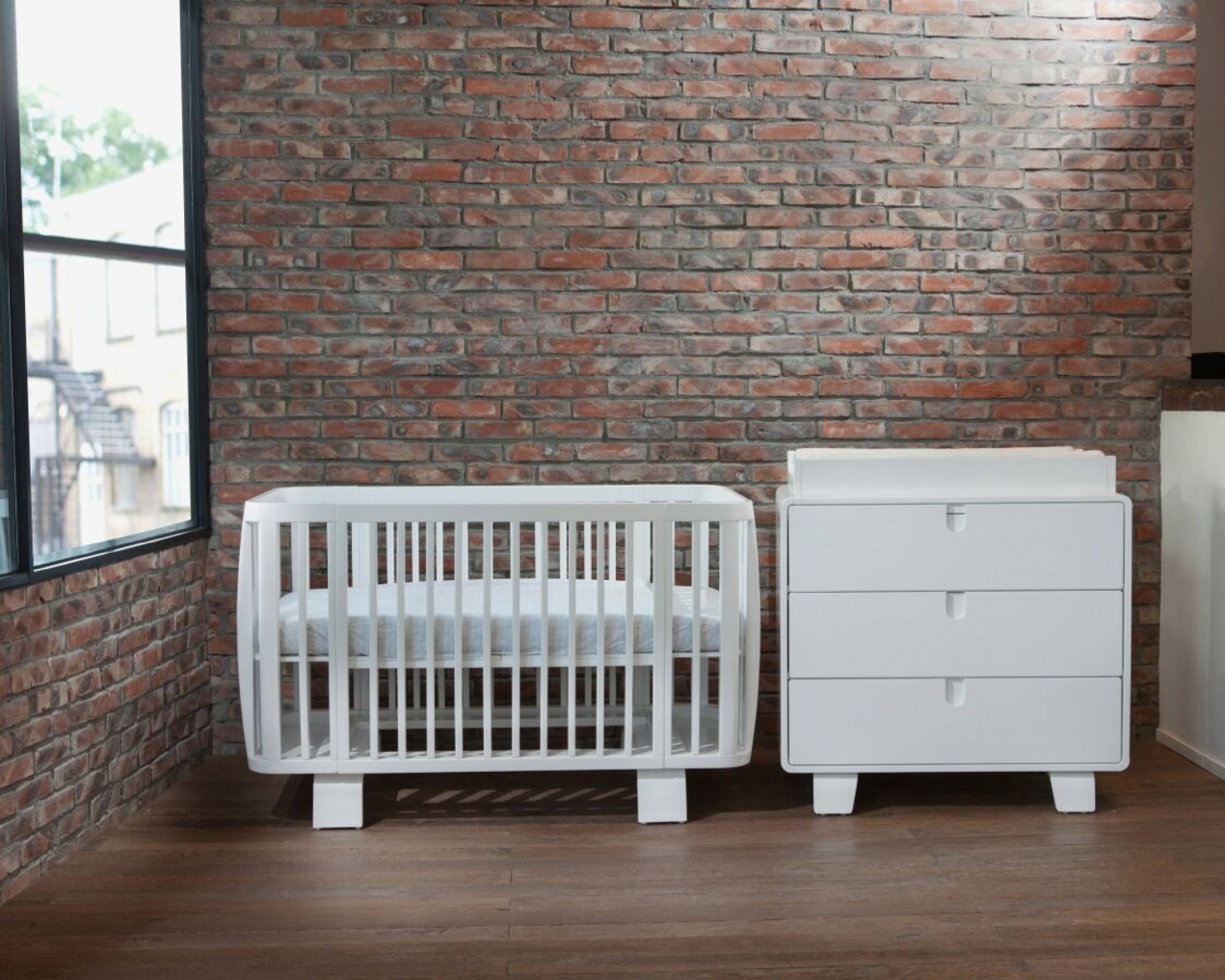 En bois massif (chêne), la commode RETRO peut être transformée en table à langer avec le plan à langer BLOOM (vendu séparément). Elle existe en 3 couleurs et se complète du Lit évolutif RETRO.