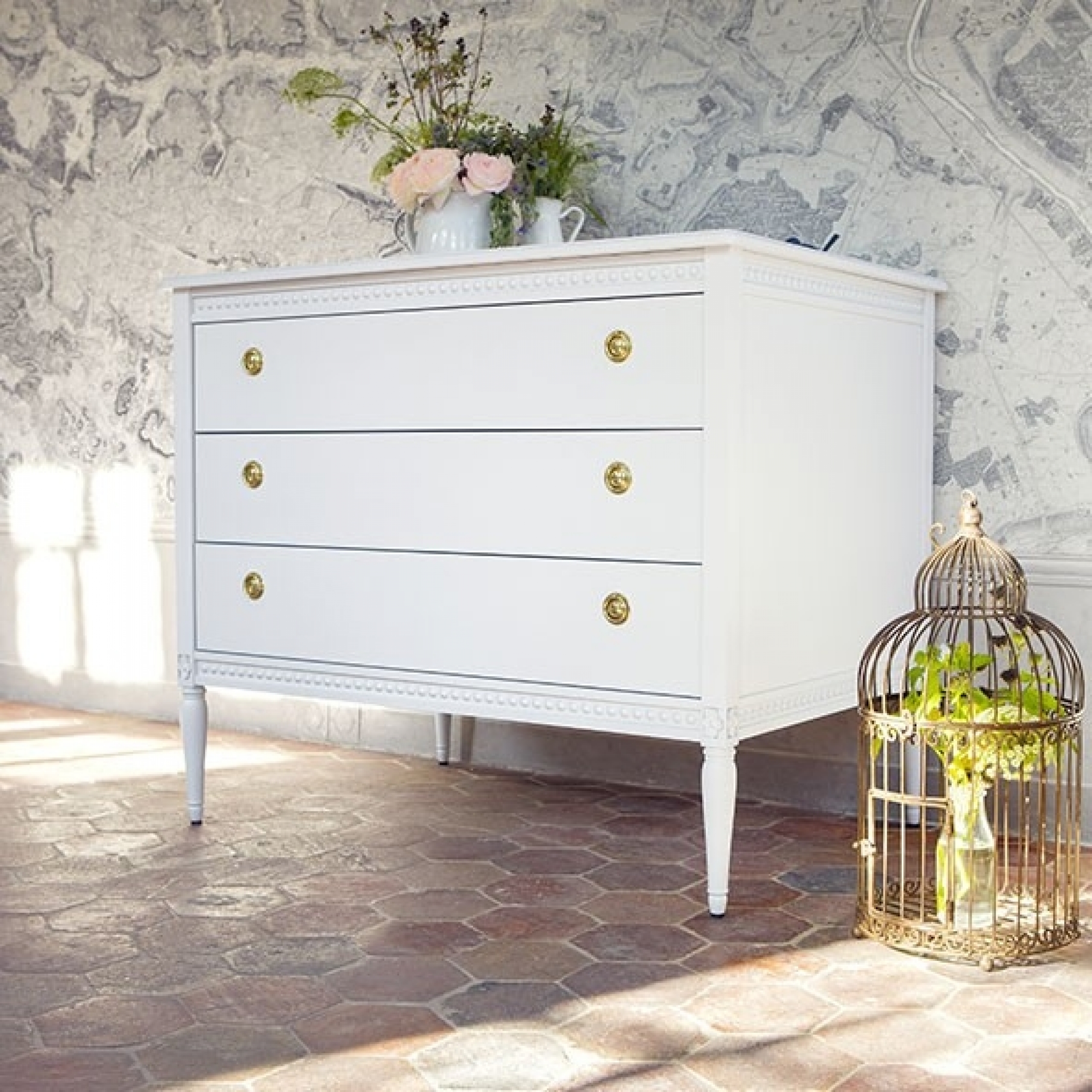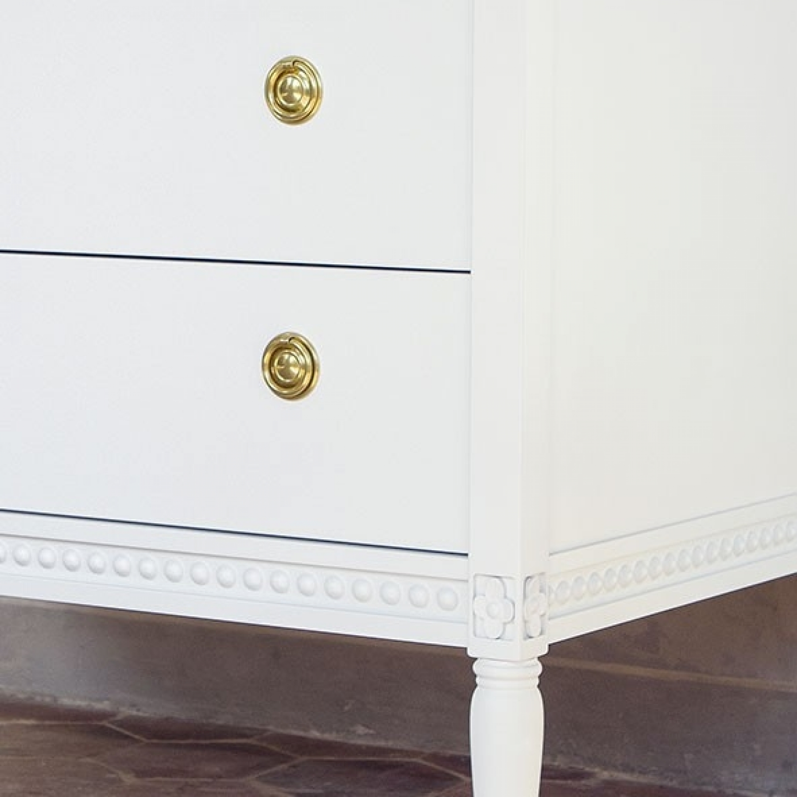 On aime le romantisme, le design harmonieux et élégant du style Gustavien. En bois massif, chaque détail est un véritable travail d'orfèvre : les roses au dessus de chaque pied et les perles qui dessinent les contours de chaque meuble.