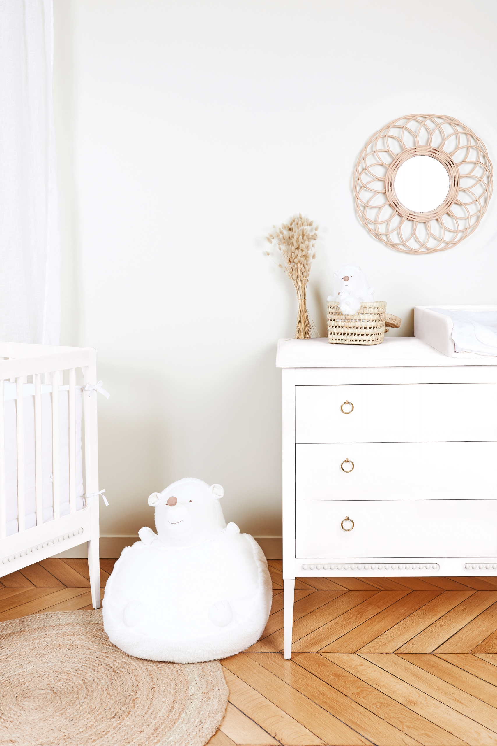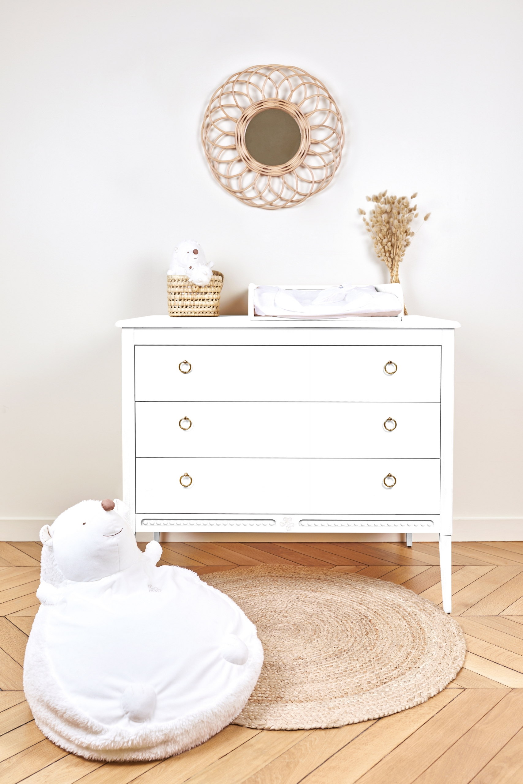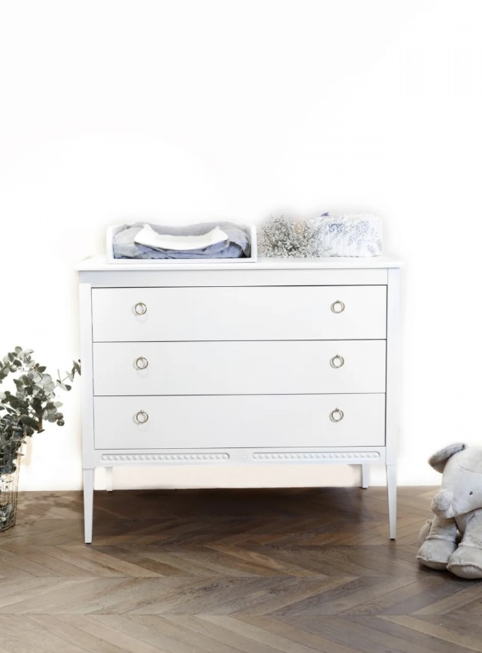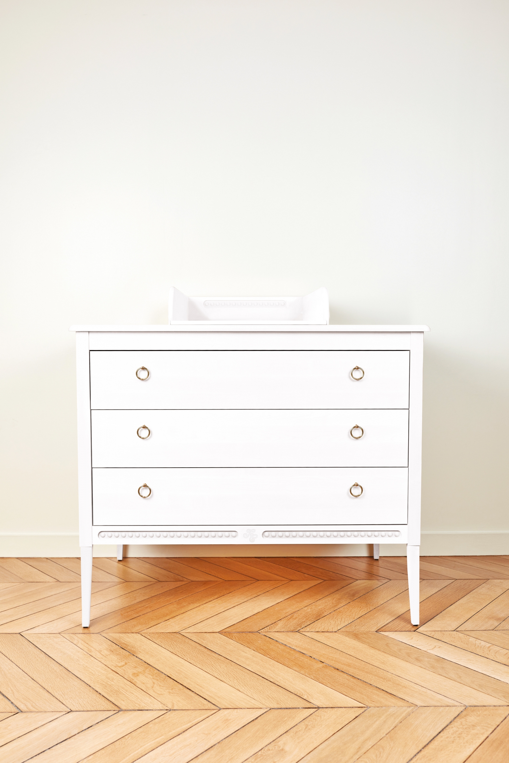 On aime le romantisme, le design harmonieux et élégant du style Gustavien. En bois massif, chaque détail de ce dispositif à langer est un véritable travail d'orfèvre sculpté à la main avec les perles qui dessinent les contours de chaque meuble et symbolisent l'élégance et le raffinement.