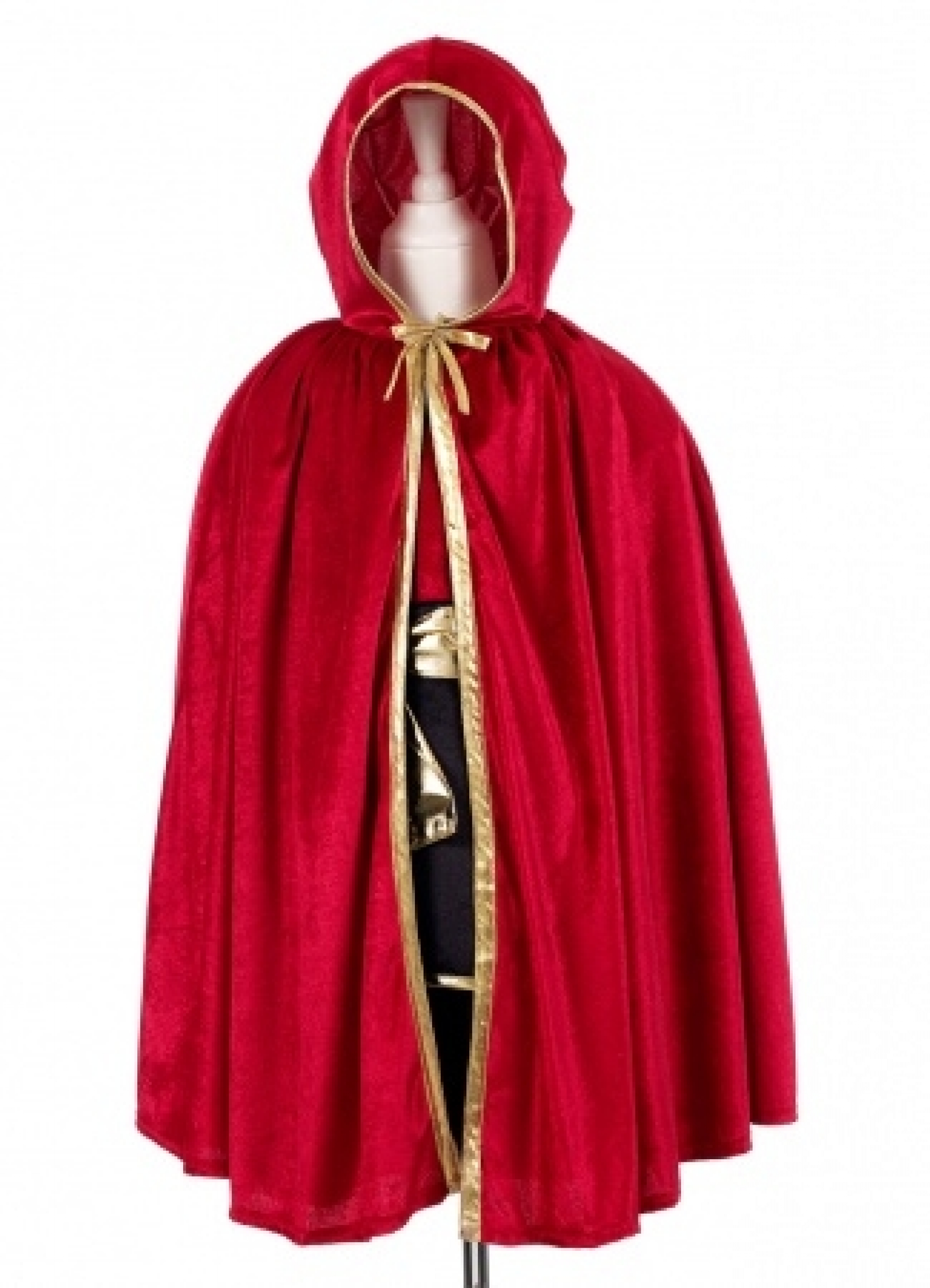 Magnifique costume de Chevalier rouge et or avec blason Fleur de Lys et grande capuche dorée. Ce déguisement se compose de 2 pièces : tunique et pantalon assorti.