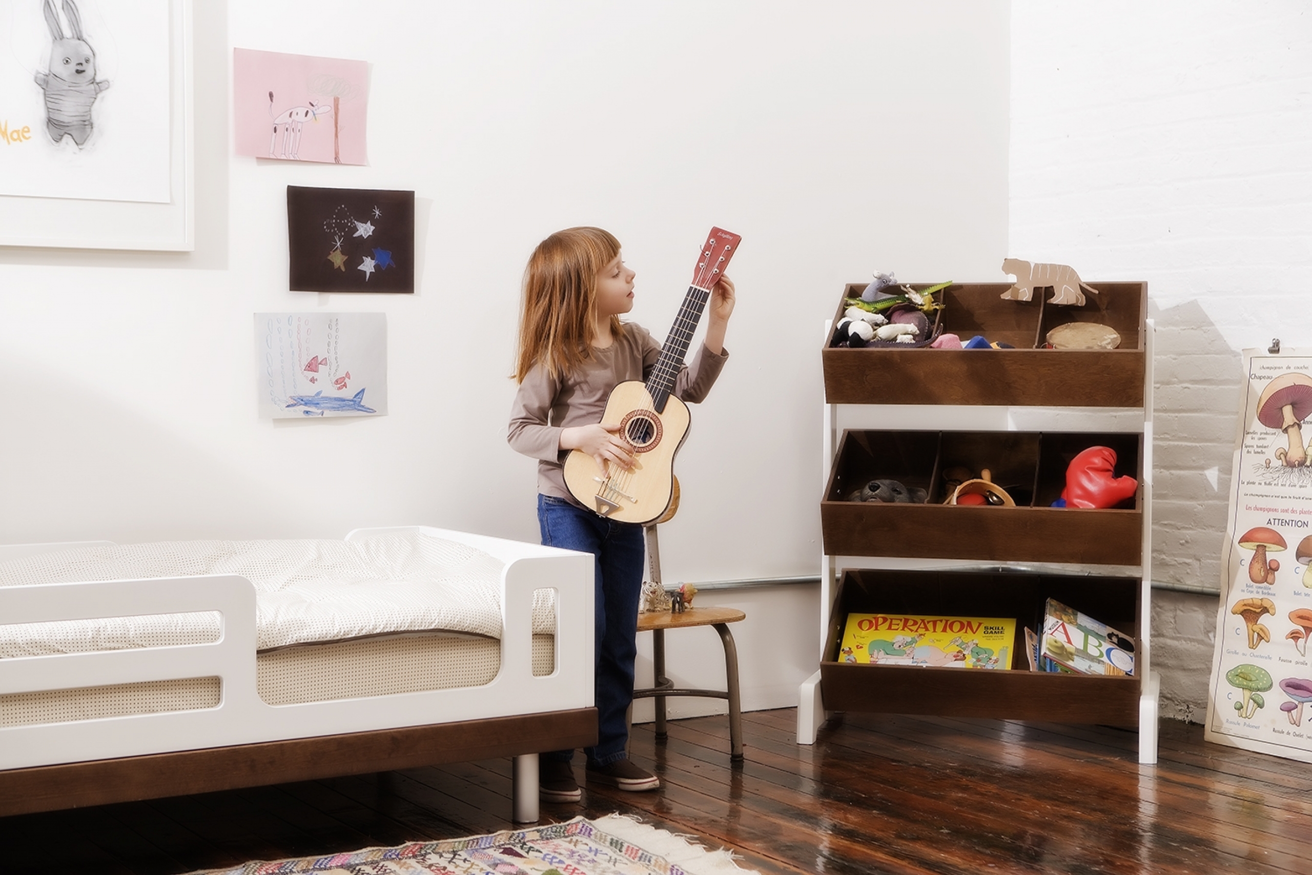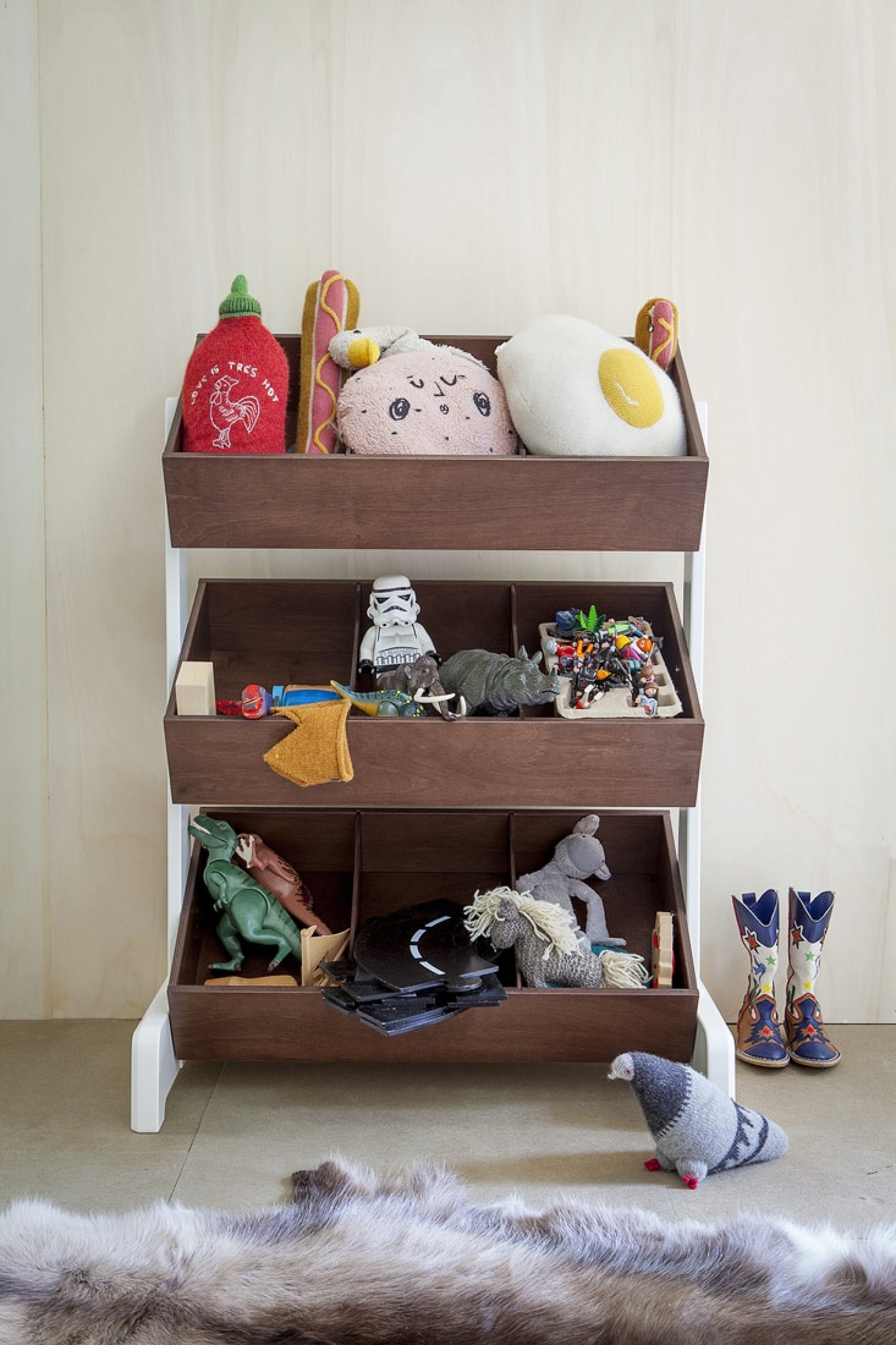 Le Toystore se décline en bouleau ou noyer et s'associe parfaitement aux meubles OEUF.