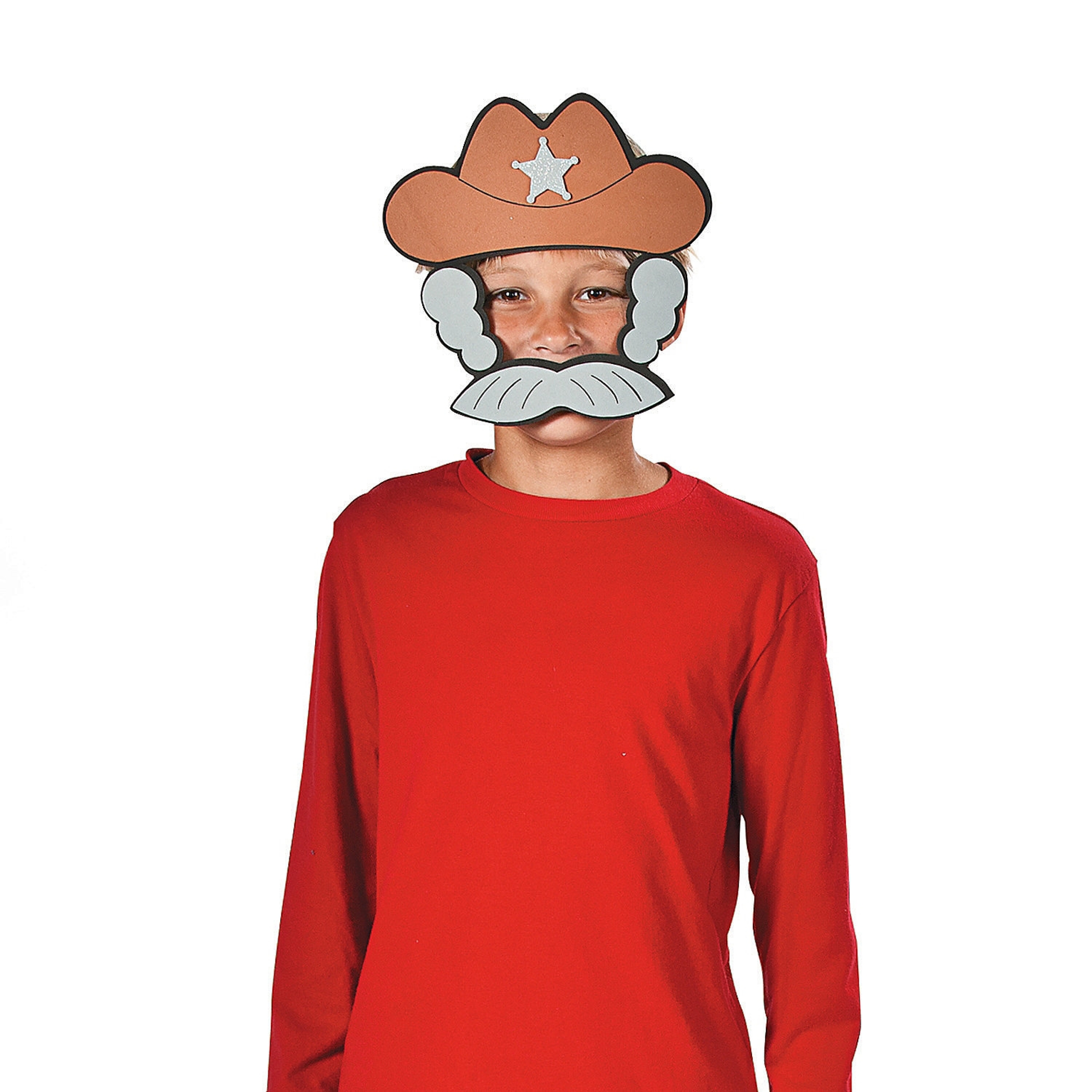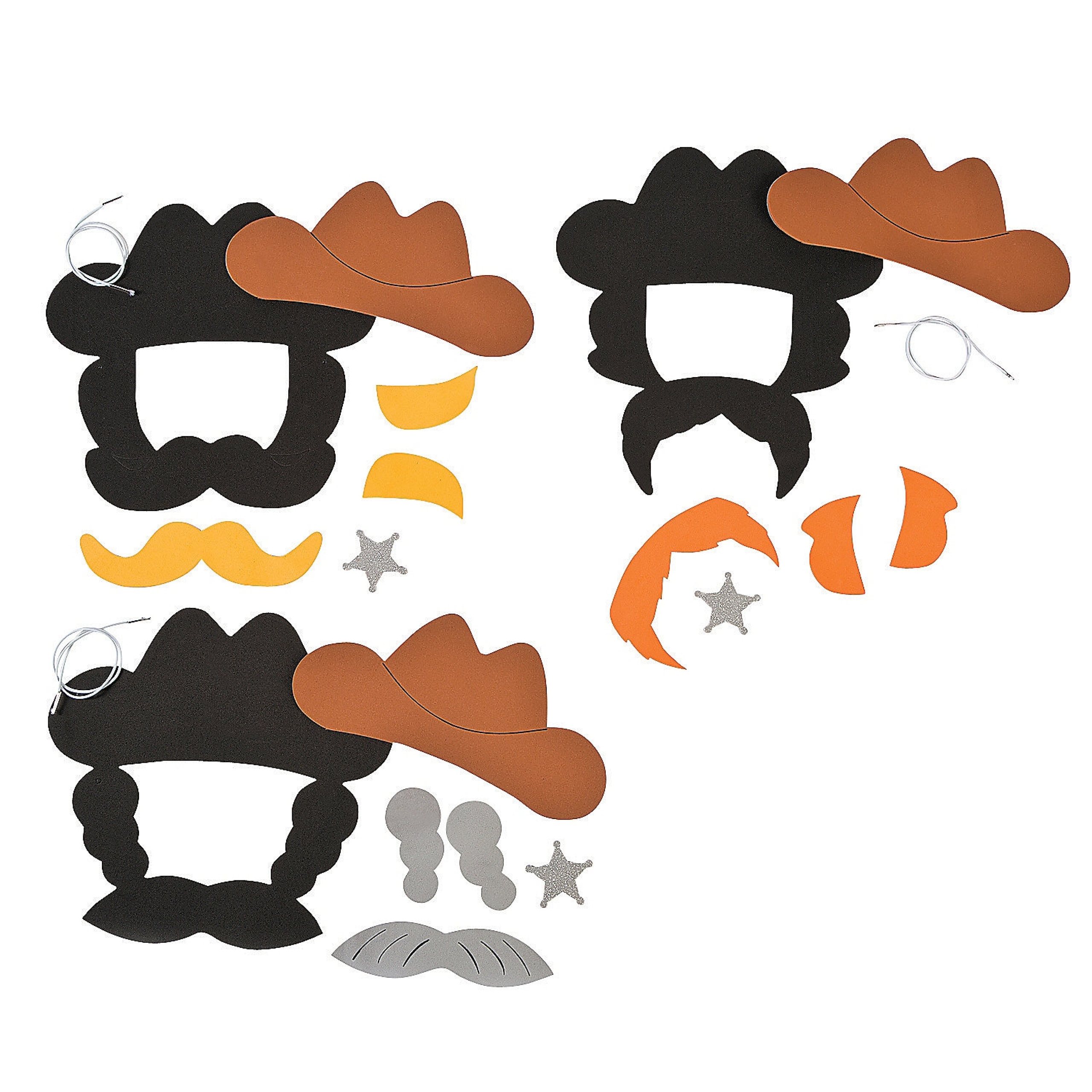 Le set, conçu pour 3 enfants, contient tout le nécessaire pour créer 3 modèles assortis de costumes / masques de Cowboy avec chapeaux, moustaches et étoiles en paillettes argentées.