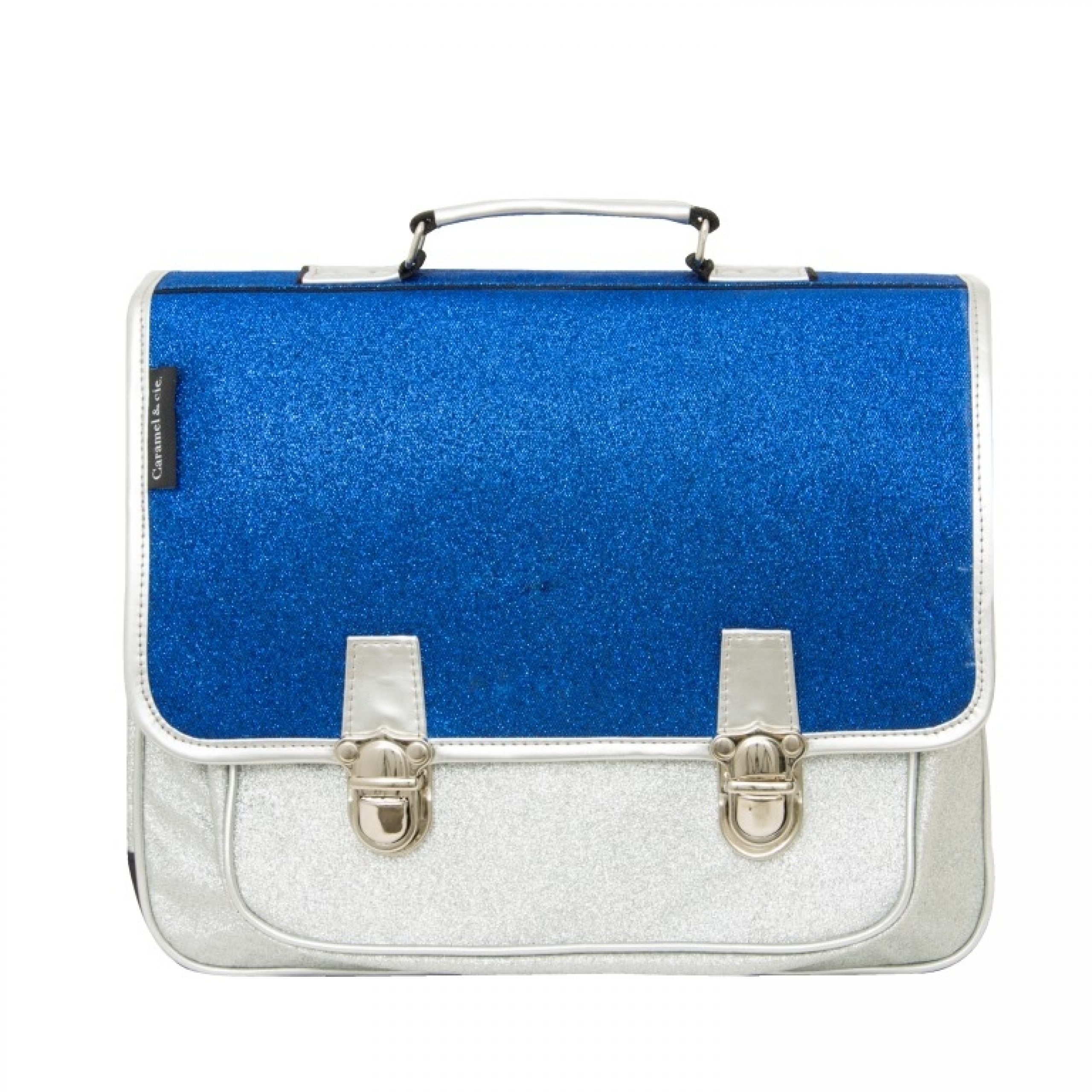 Voici l'un des très jolis succès de la marque Caramel & Cie ! Un cartable bicolore bleu et argent en paillettes.