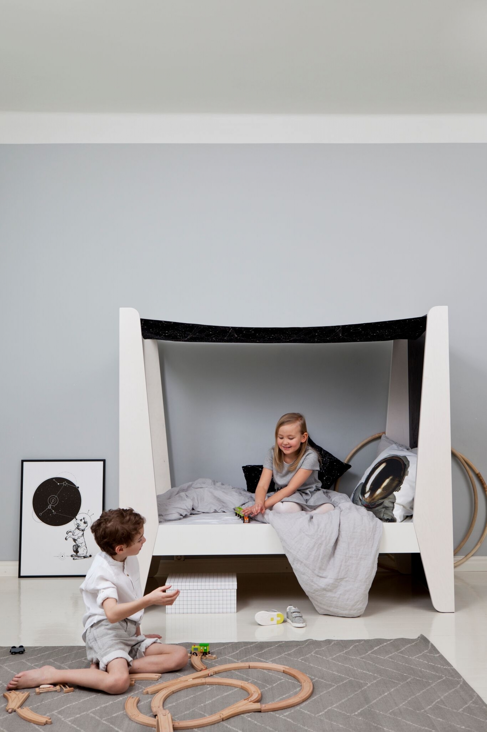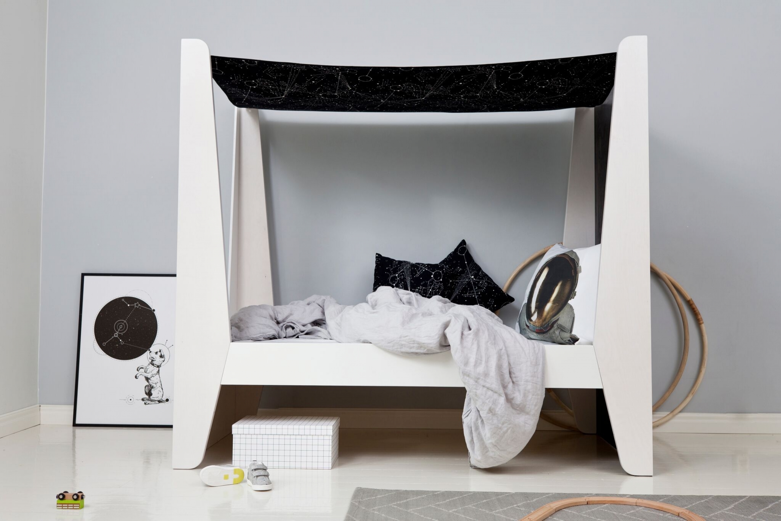 Le Lit Cabane Baldaquin KETARA imaginé par la marque finlandaise LUMOKIDS vous séduira avec son ciel de lit si romantique et fera rêver vos enfants.