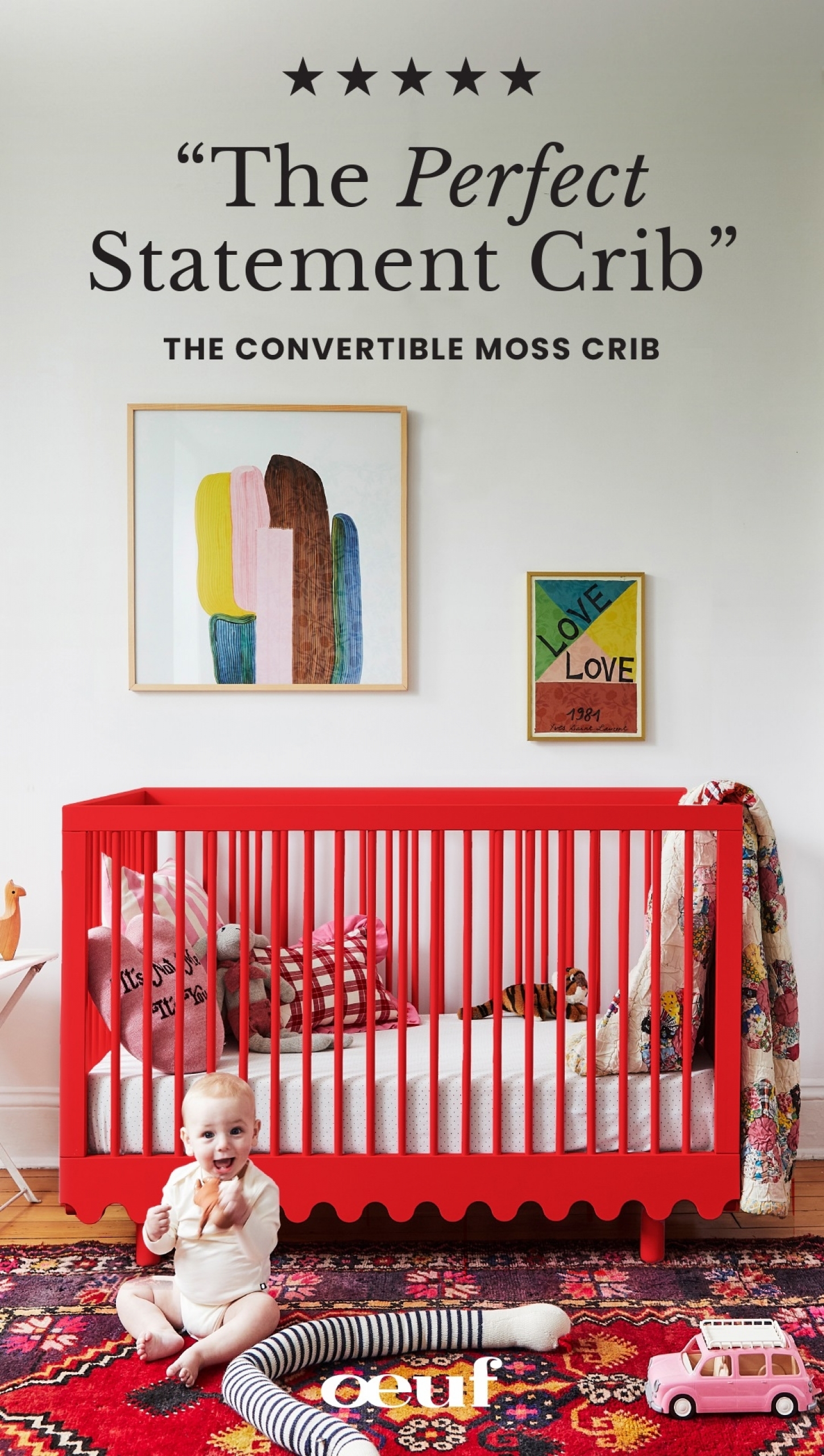 Le lit bébé MOSS en bouleau rouge tomate a été imaginé par la célèbre marque OEUF NYC. Il est à la fois design et écologique comme tous les produits de cette marque américaine. On aime le design très original et audacieux de la collection MOSS avec cette découpe en forme de vagues et l'association avec le bois de couleur rouge.