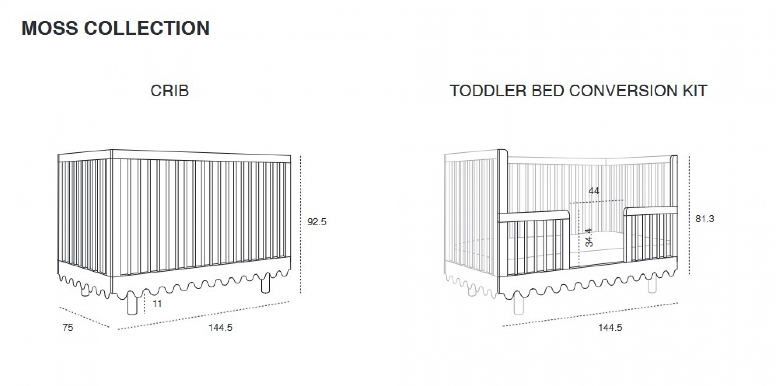 Le lit bébé MOSS 70 x 140 cm est évolutif et se transforme en lit Junior grâce au Kit de transformation Moss disponible en option.