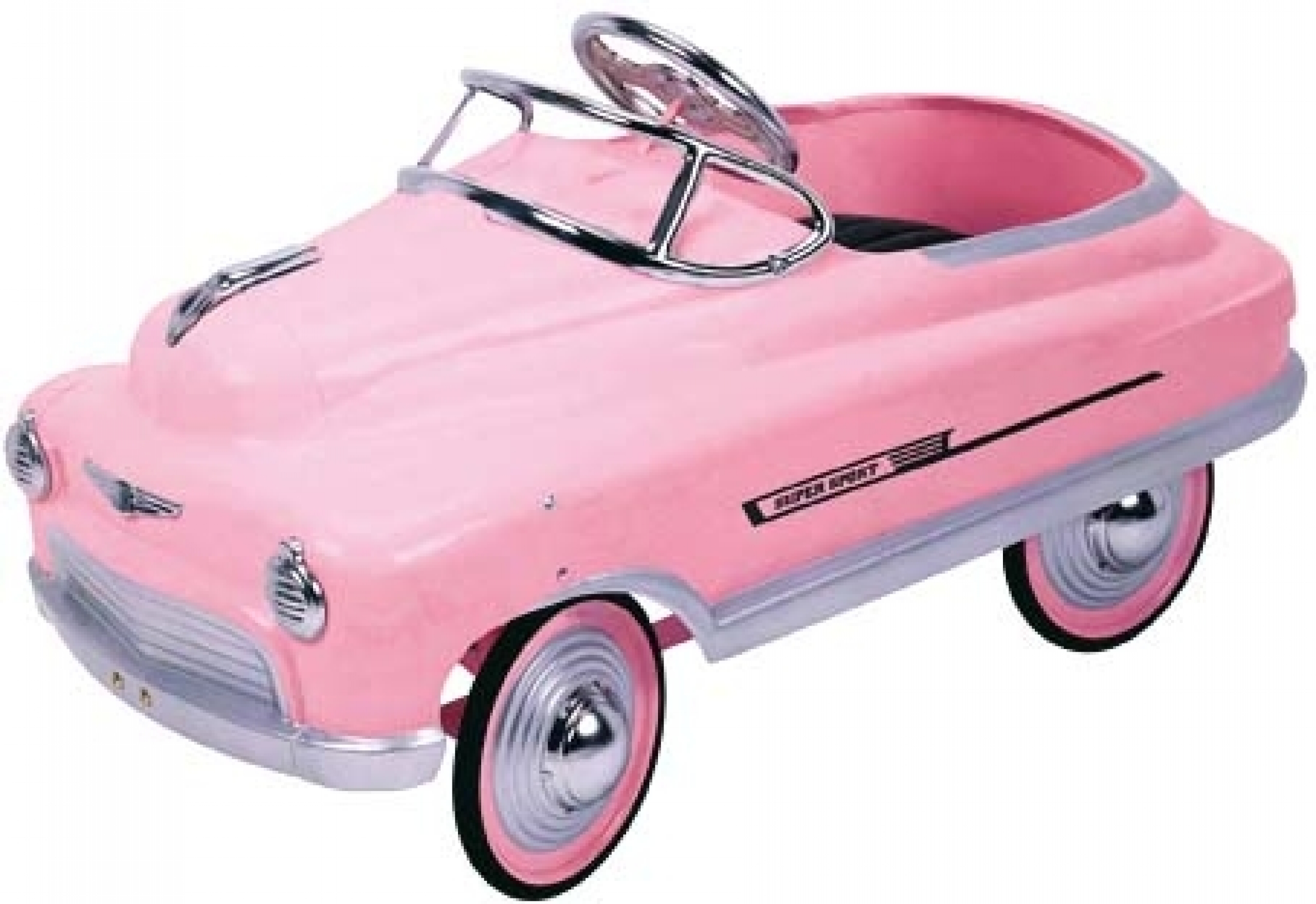 Cette sublime voiture à pédales pour enfants en métal laqué et chromé rose est inspirée des années 50.